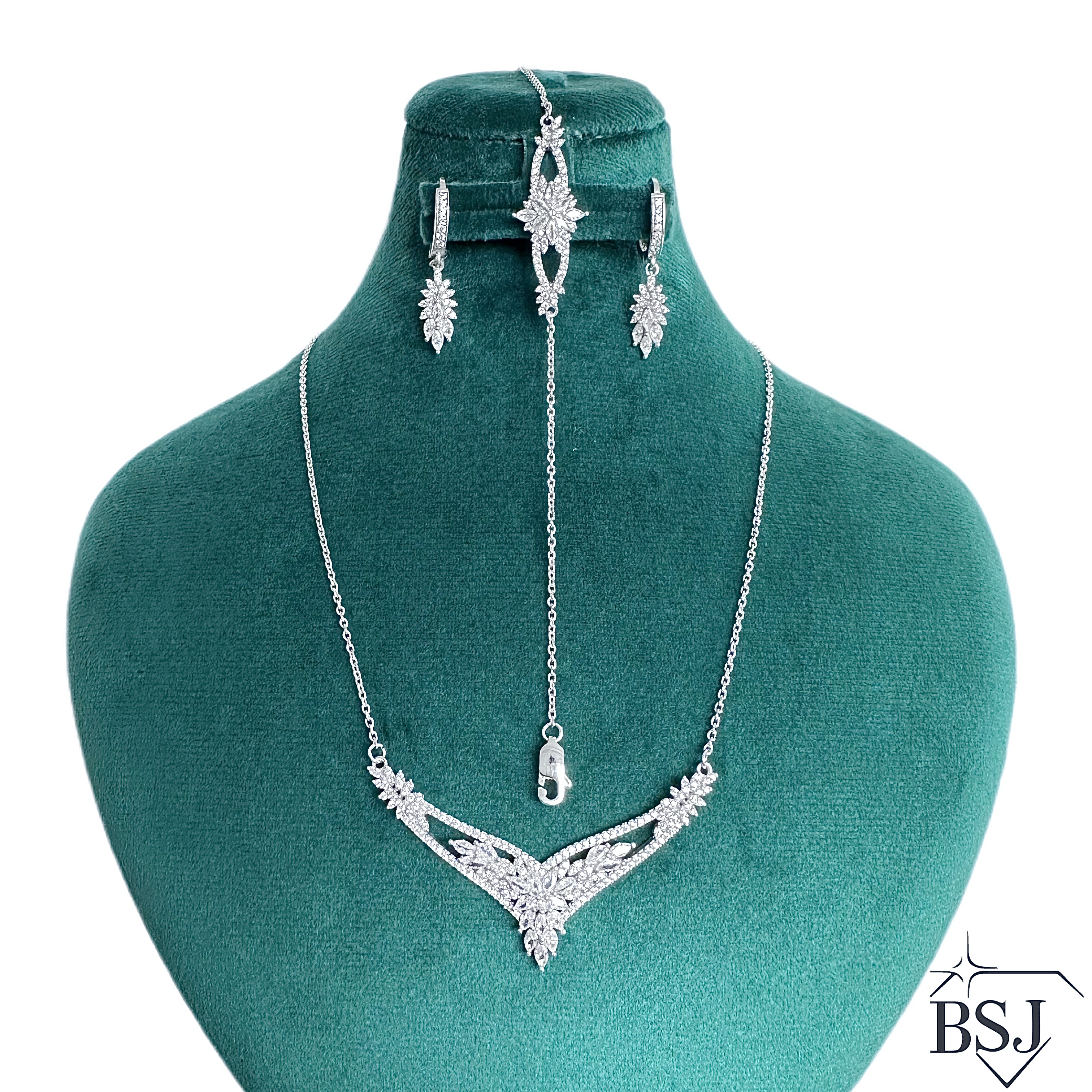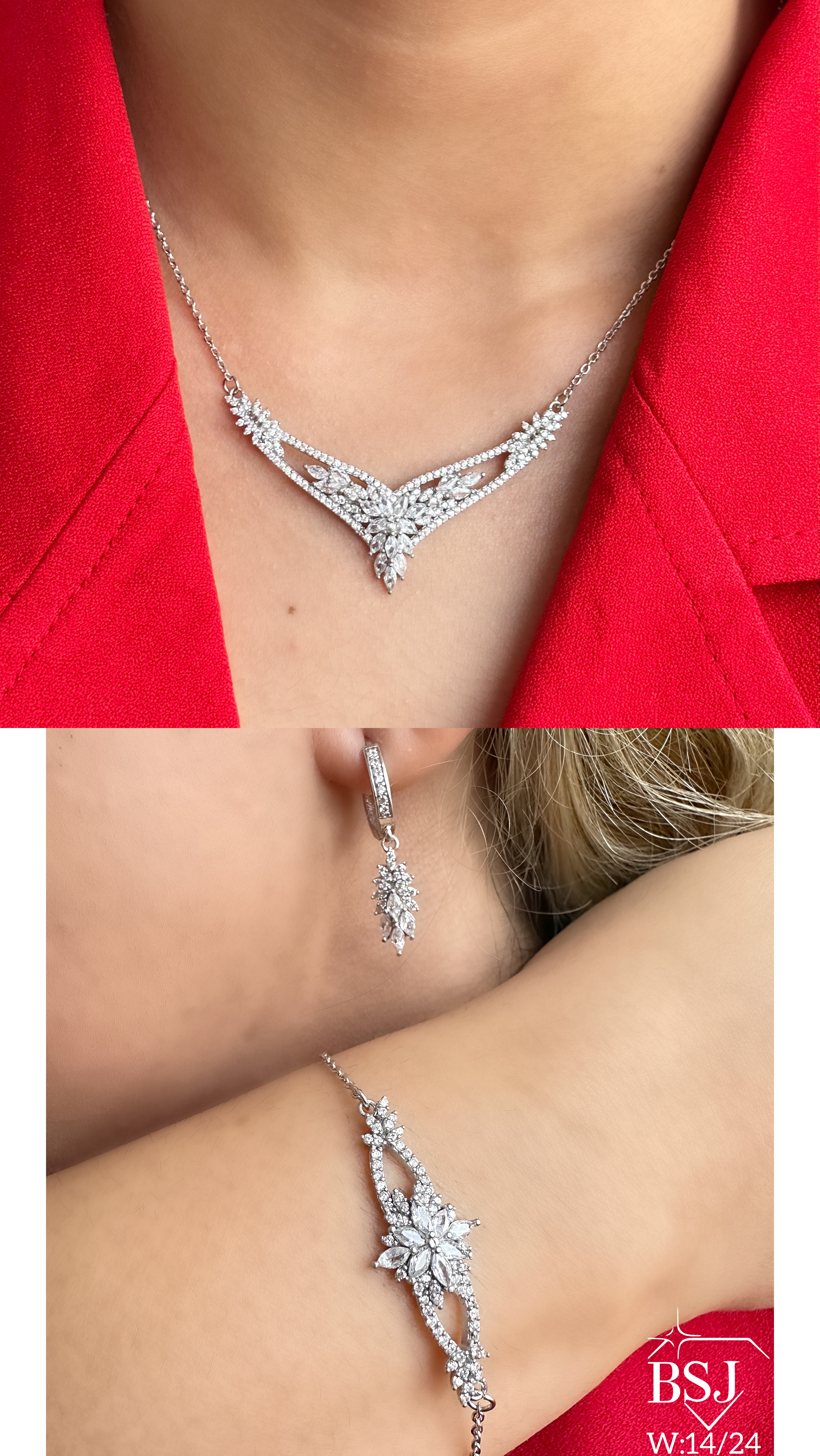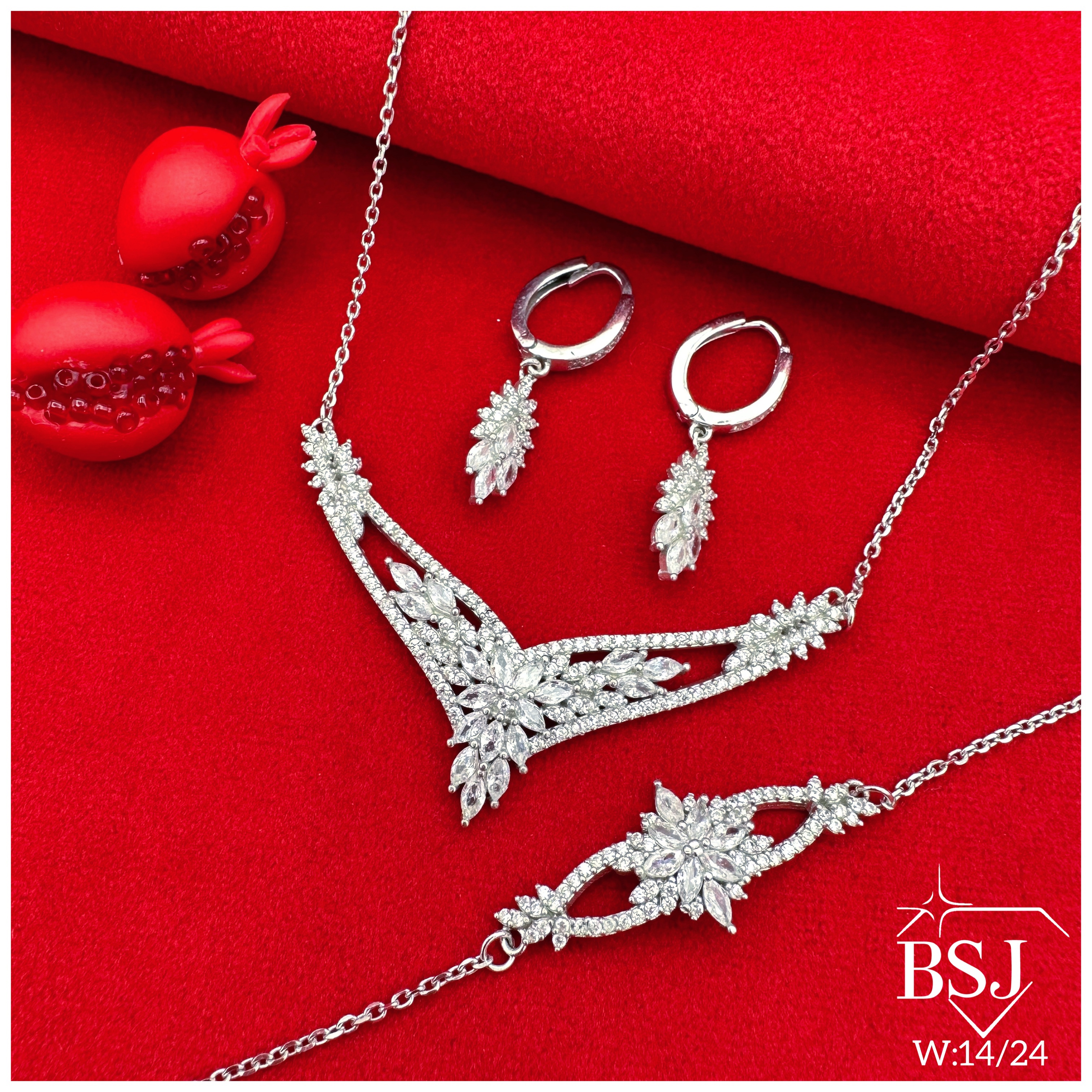 سرویس نقره جواهری زنانه BSJ_S598 از سرویس های زنجیری ساخته شده از نقره با عیار 925 می باشد.سنگ های به کار رفته در آن برلیان و امرالد از جنس اتمی زیرکونیا می باشند که به صورت میکروستینگ مخراج کاری شده اند و در برابر ضربه مقاوم اند.آبکاری دو مرحله ای رودیوم (طلا سفید)، سبب کیفیت بی نظیر دوام رنگ آن شده است و به دلیل عدم استفاده از نیکل در ساختار آن، بدون حساسیت بوده و با پوست حساس سازگار است.به دلیل کیفیت فوق العاده و درخشش عالی سنگ ها، تفاوتی با نمونه طلا ندارد.وزن سرویس +-14.24 گرم می باشد.