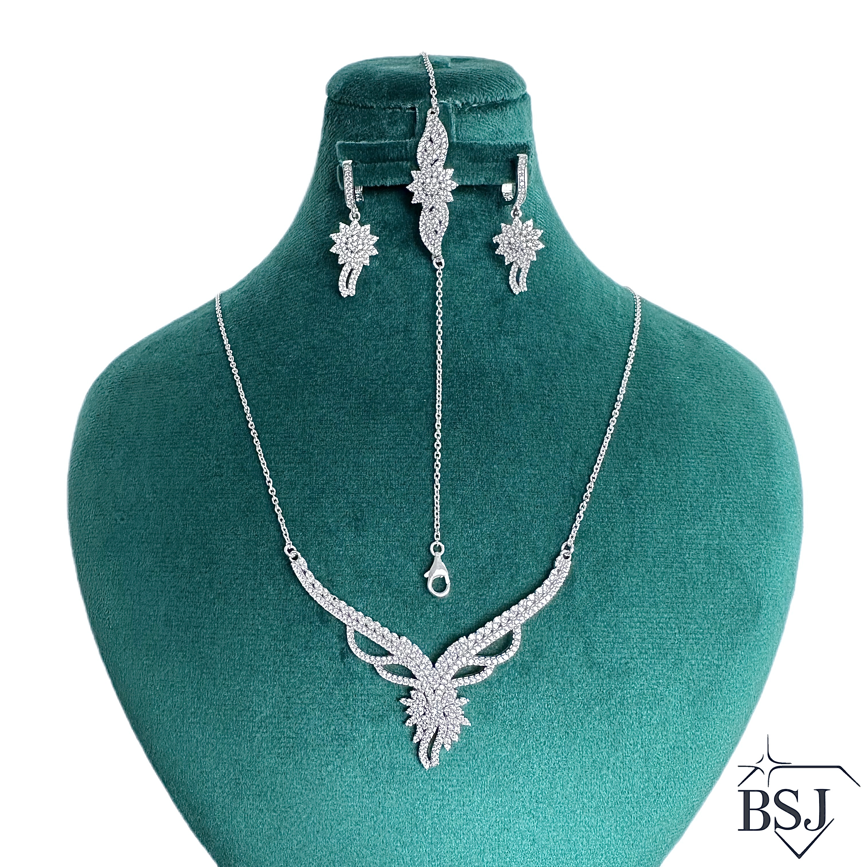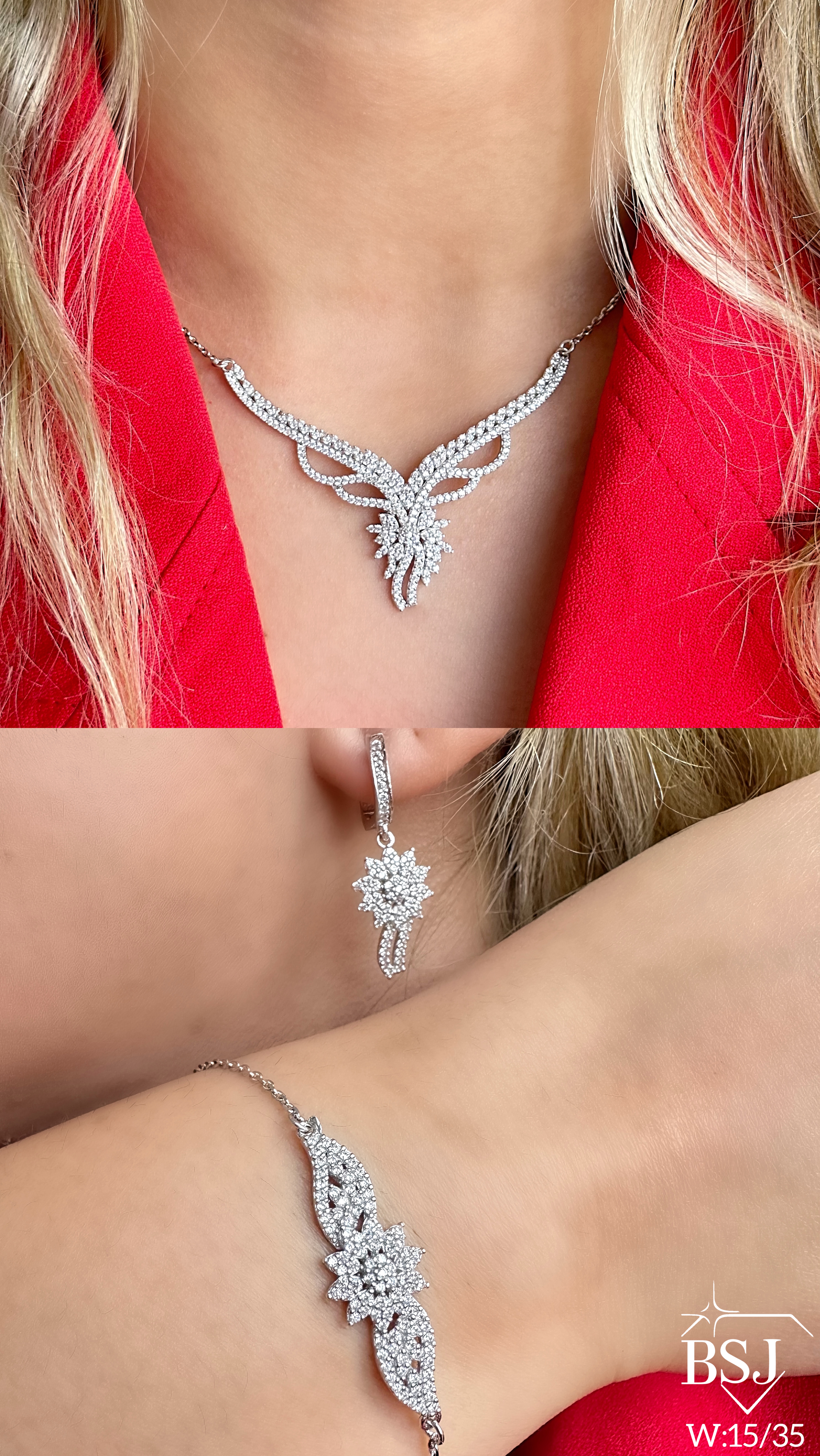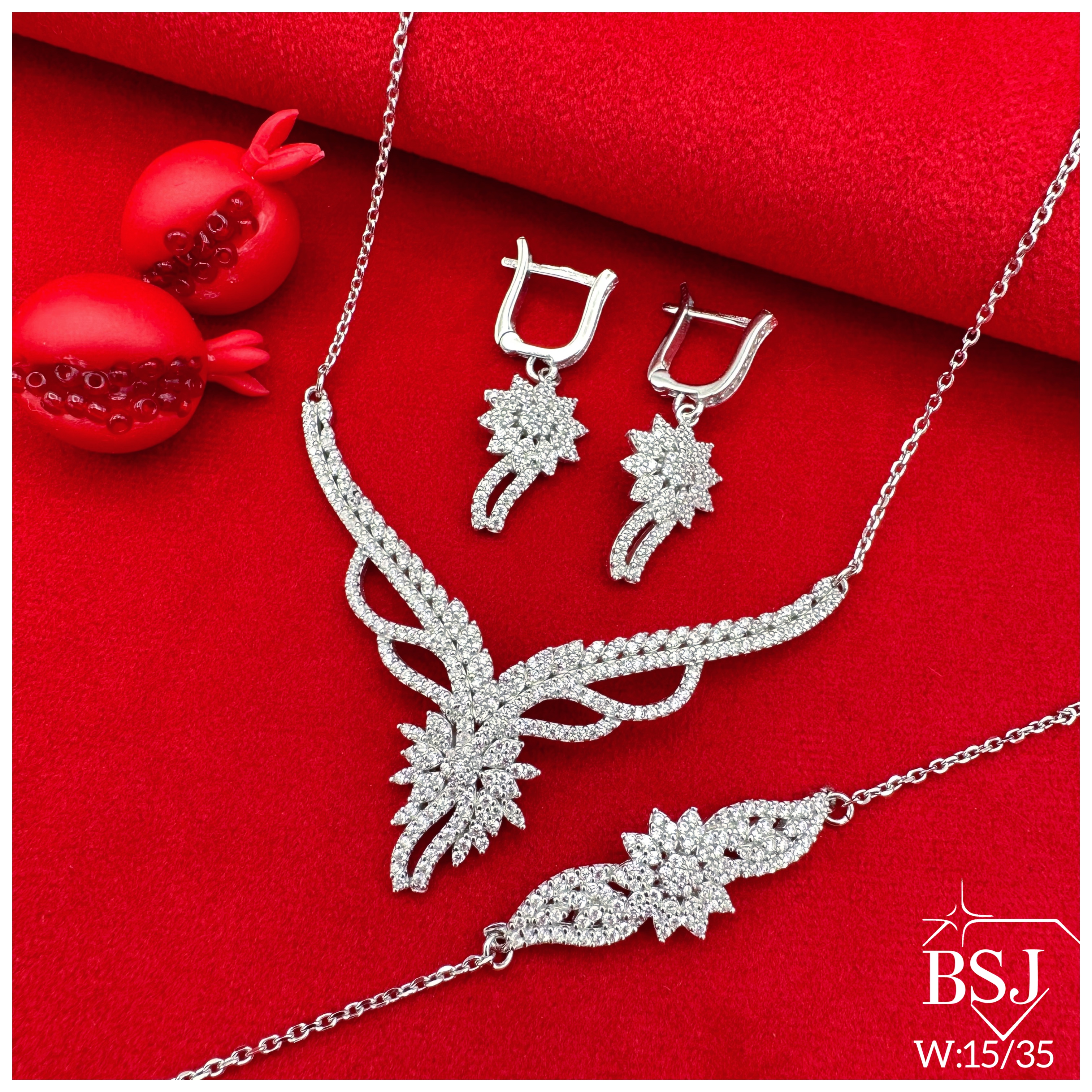 سرویس نقره جواهری زنانه BSJ_S599 از سرویس های زنجیری ساخته شده از نقره با عیار 925 می باشد.سنگ های به کار رفته در آن برلیان و امرالد از جنس اتمی زیرکونیا می باشند که به صورت میکروستینگ مخراج کاری شده اند و در برابر ضربه مقاوم اند.آبکاری دو مرحله ای رودیوم (طلا سفید)، سبب کیفیت بی نظیر دوام رنگ آن شده است و به دلیل عدم استفاده از نیکل در ساختار آن، بدون حساسیت بوده و با پوست حساس سازگار است.به دلیل کیفیت فوق العاده و درخشش عالی سنگ ها، تفاوتی با نمونه طلا ندارد.وزن سرویس +-15.35گرم می باشد.