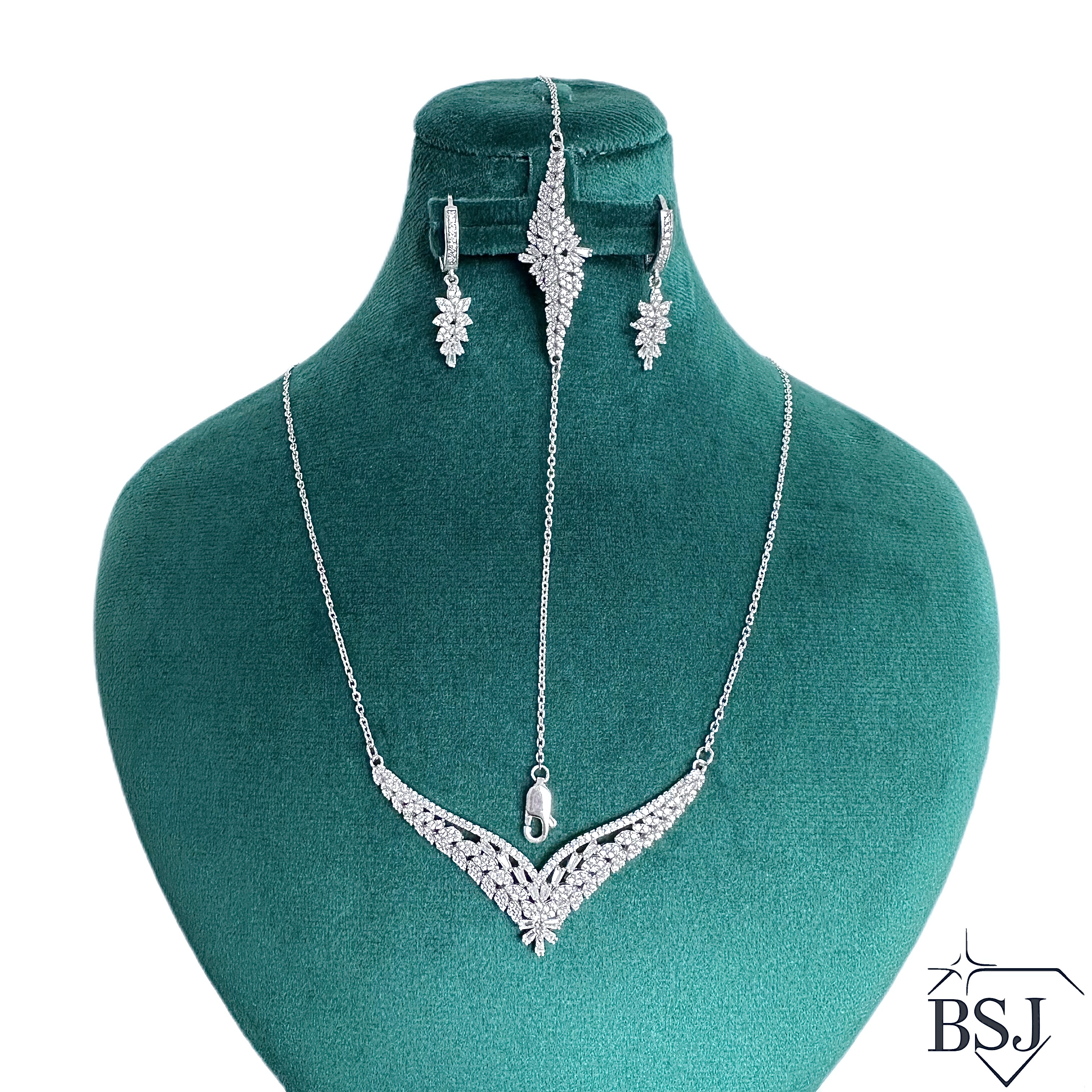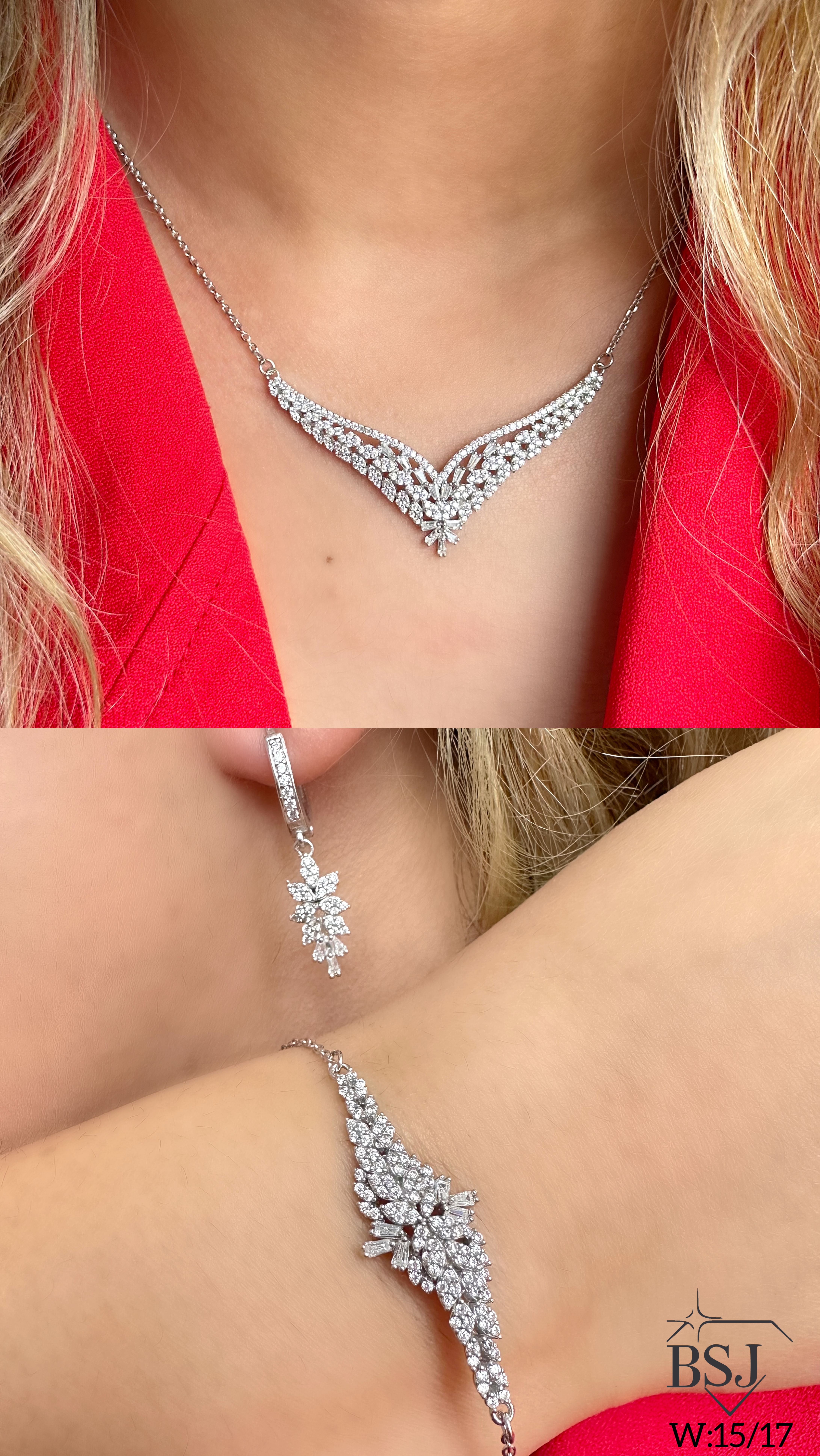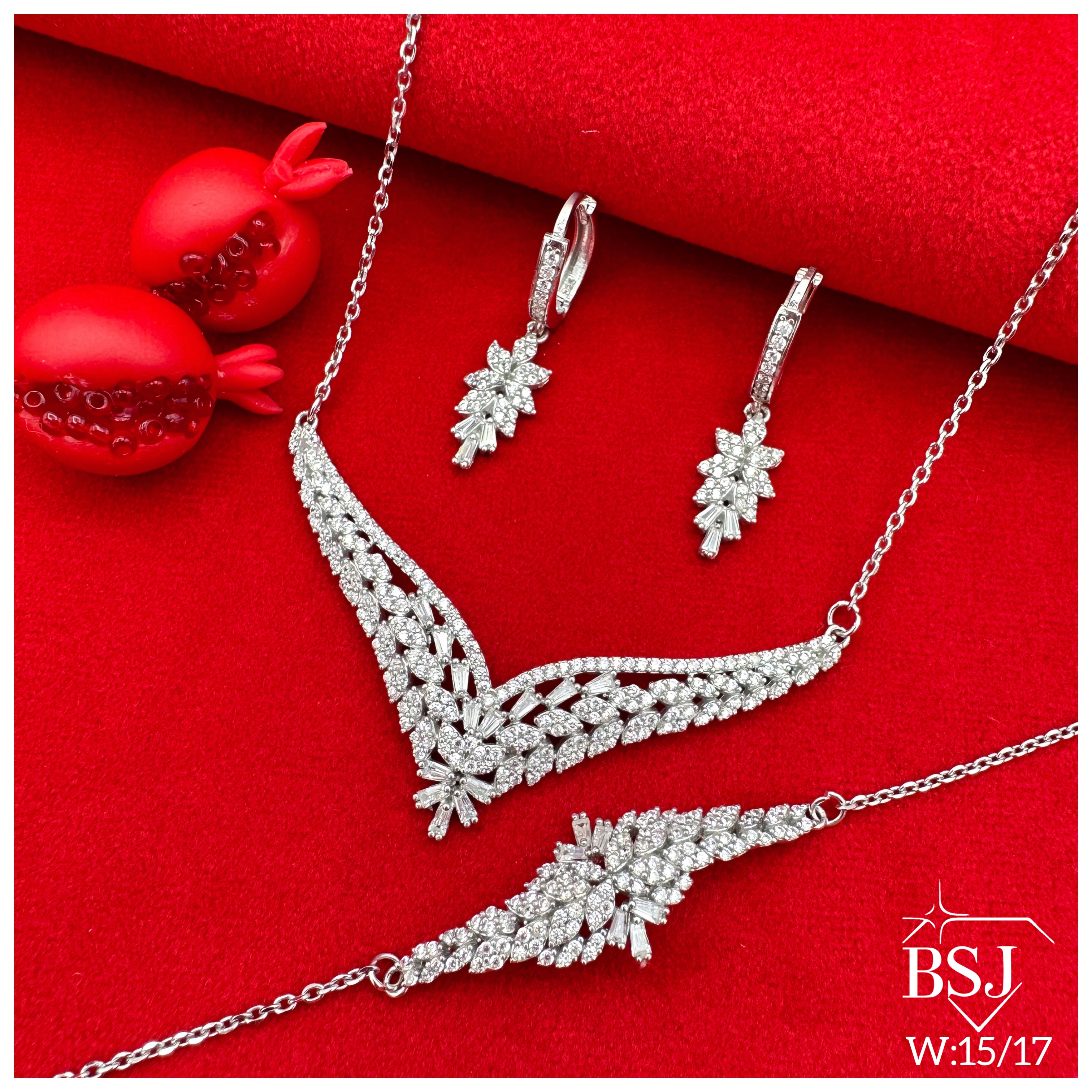 سرویس نقره جواهری زنانه BSJ_S600 از سرویس های زنجیری ساخته شده از نقره با عیار 925 می باشد.سنگ های به کار رفته در آن برلیان و امرالد از جنس اتمی زیرکونیا می باشند که به صورت میکروستینگ مخراج کاری شده اند و در برابر ضربه مقاوم اند.آبکاری دو مرحله ای رودیوم (طلا سفید)، سبب کیفیت بی نظیر دوام رنگ آن شده است و به دلیل عدم استفاده از نیکل در ساختار آن، بدون حساسیت بوده و با پوست حساس سازگار است.به دلیل کیفیت فوق العاده و درخشش عالی سنگ ها، تفاوتی با نمونه طلا ندارد.وزن سرویس +-15.17گرم می باشد.