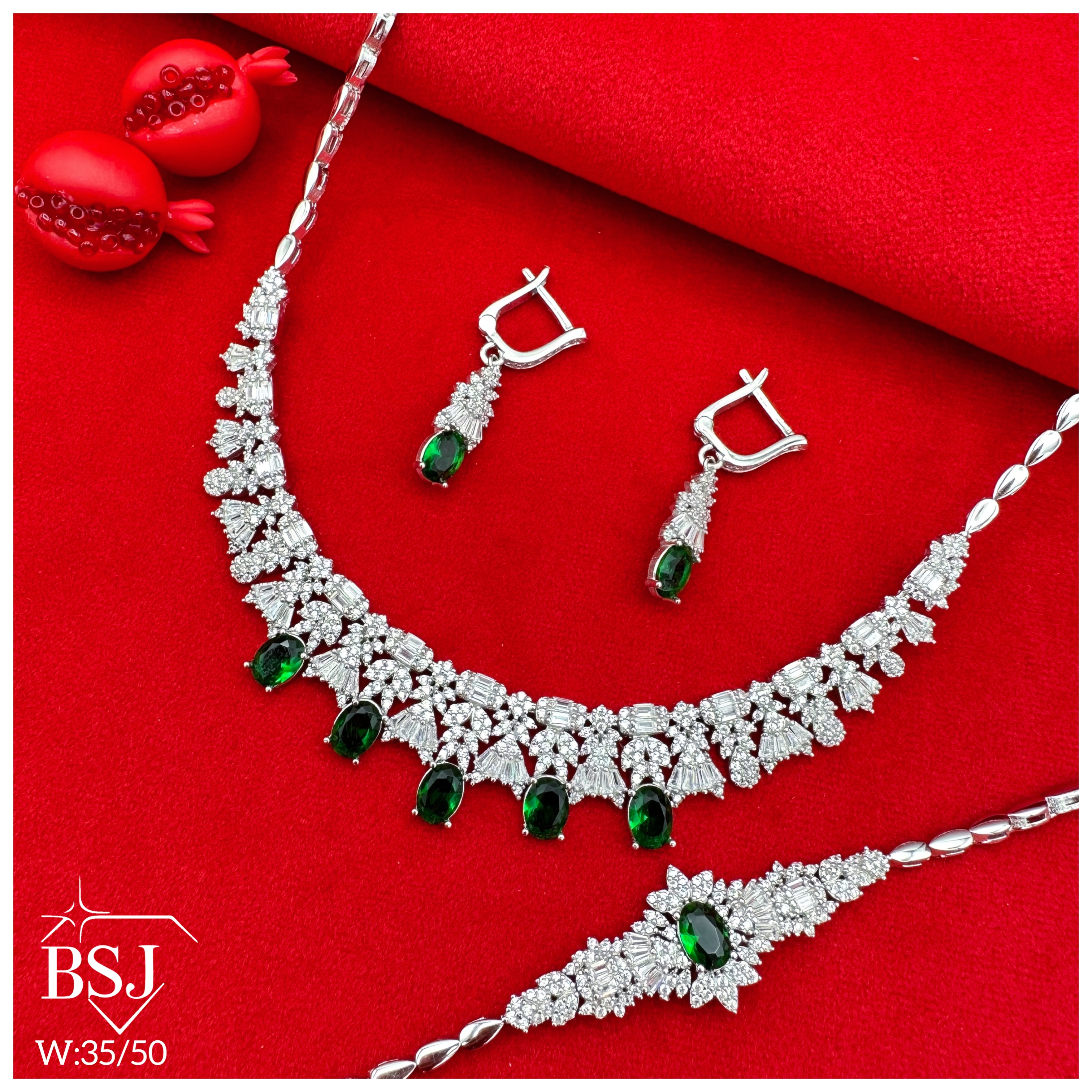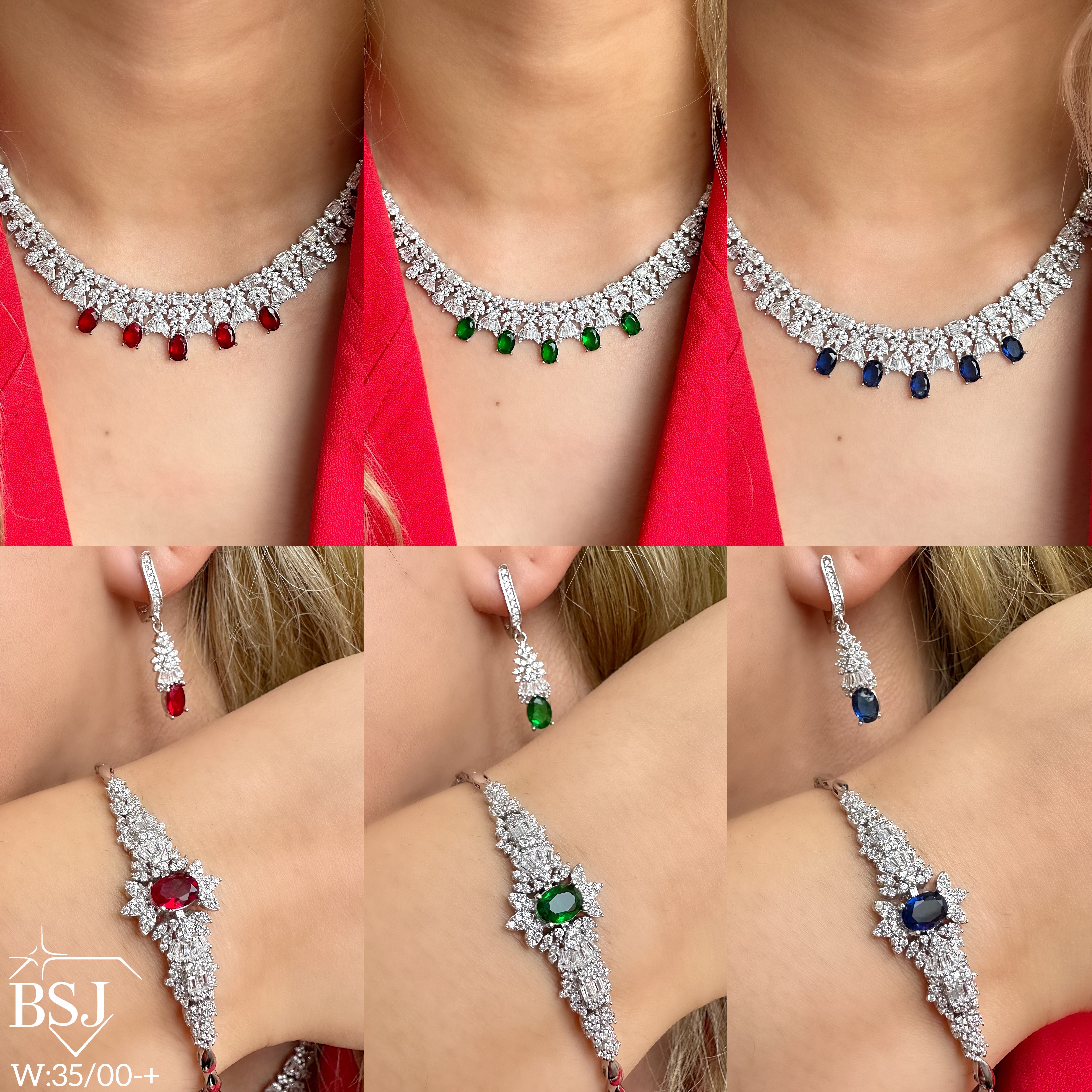 سرویس نقره جواهری زنانه BSJ_S601 از سرویس های شیک و لوکس ساخته شده از نقره با عیار 925 می باشد.سنگ های به کار رفته در آن برلیان ، مارکیز و امرالد از جنس اتمی زیرکونیا و سنگ های سنتتیک (آزمایشگاهی) در سه رنگ می باشند که به صورت میکروستینگ مخراج کاری شده اند و در برابر ضربه مقاوم اند.آبکاری دو مرحله ای رودیوم (طلا سفید)، سبب کیفیت بی نظیر دوام رنگ آن شده است و به دلیل عدم استفاده از نیکل در ساختار آن،بدون حساسیت بوده و با پوست حساس سازگار است.به دلیل کیفیت فوق العاده و درخشش عالی سنگ ها، تفاوتی با نمونه طلا ندارد.وزن سرویس+- 35.00 گرم می باشد.