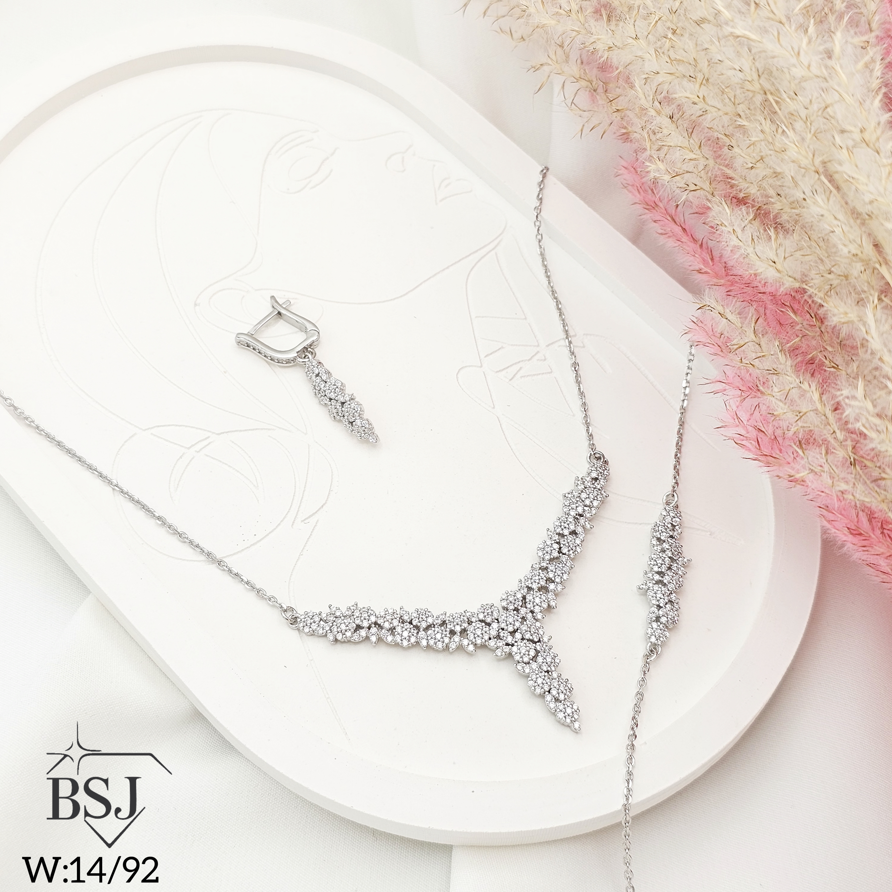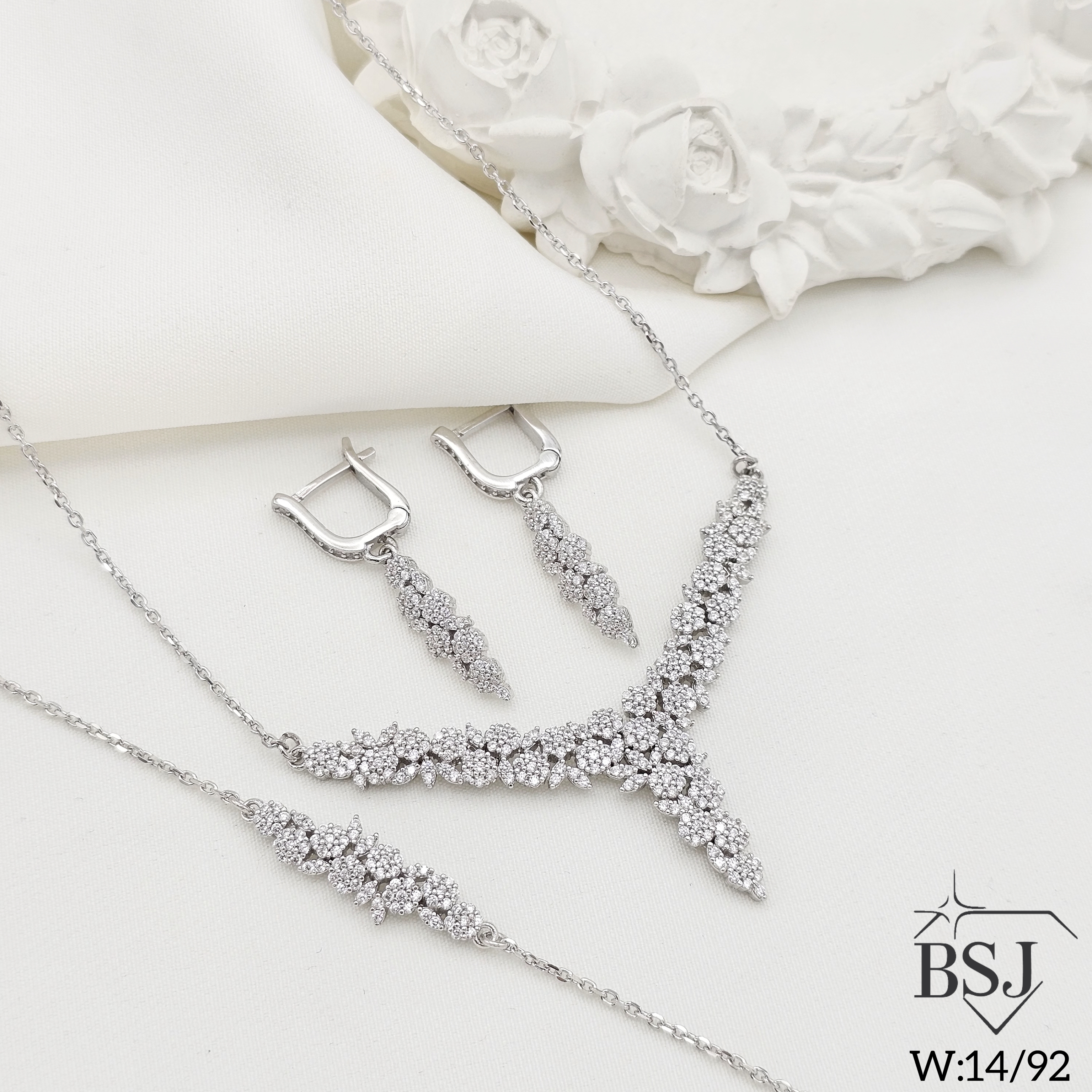 سرویس نقره زنجیری زنانه BSJ_S607 از سرویس های شیک و لوکس ساخته شده از نقره با عیار 925 می باشد.سنگ های به کار رفته در آن برلیان از جنس اتمی زیرکونیا می باشند که به صورت میکروستینگ مخراج کاری شده اند و در برابر ضربه مقاوم اند.آبکاری دو مرحله ای رودیوم (طلا سفید)، سبب کیفیت بی نظیر دوام رنگ آن شده است و به دلیل عدم استفاده از نیکل در ساختار آن،بدون حساسیت بوده و با پوست حساس سازگار است.به دلیل کیفیت فوق العاده و درخشش عالی سنگ ها، تفاوتی با نمونه طلا ندارد.وزن سرویس 14.92گرم می باشد.