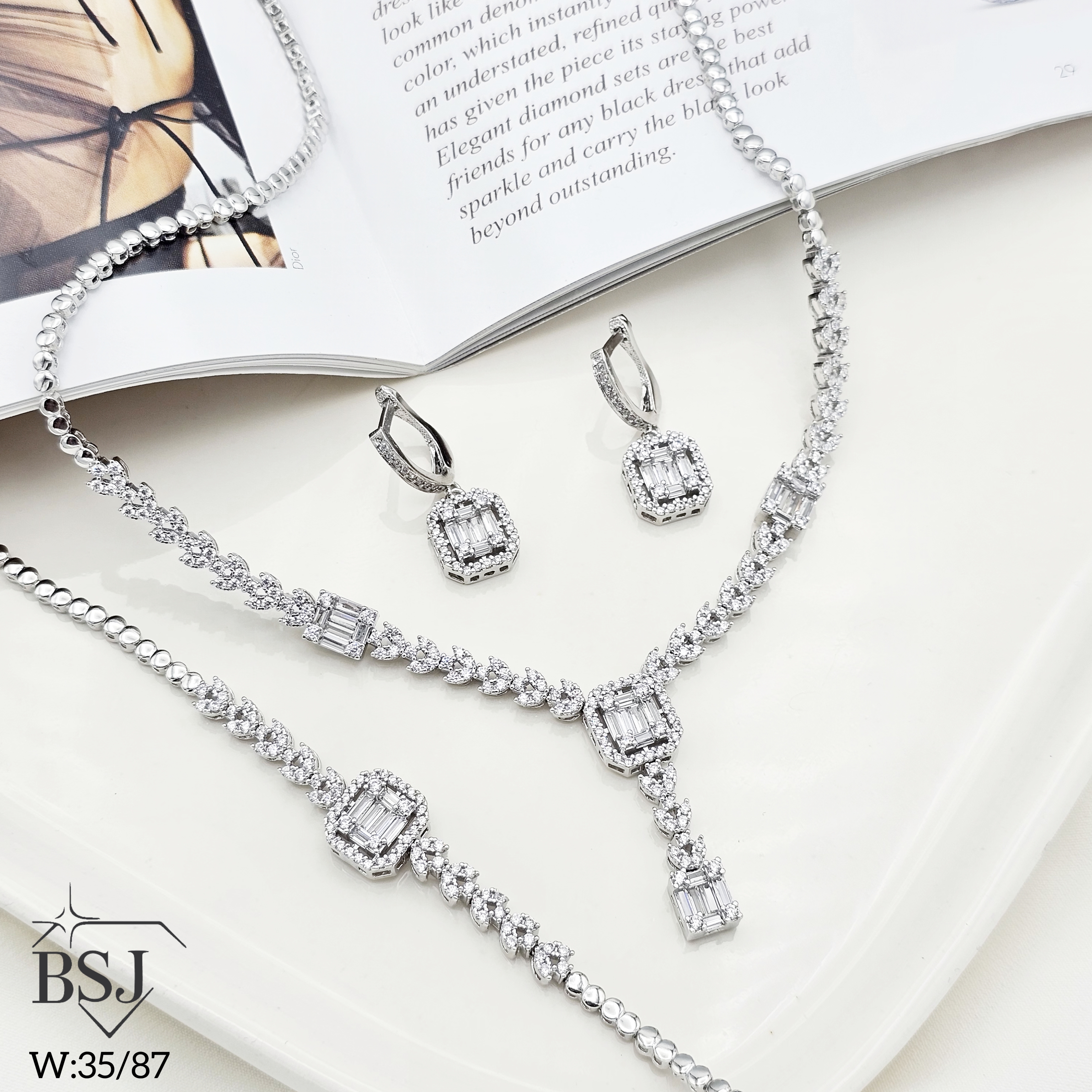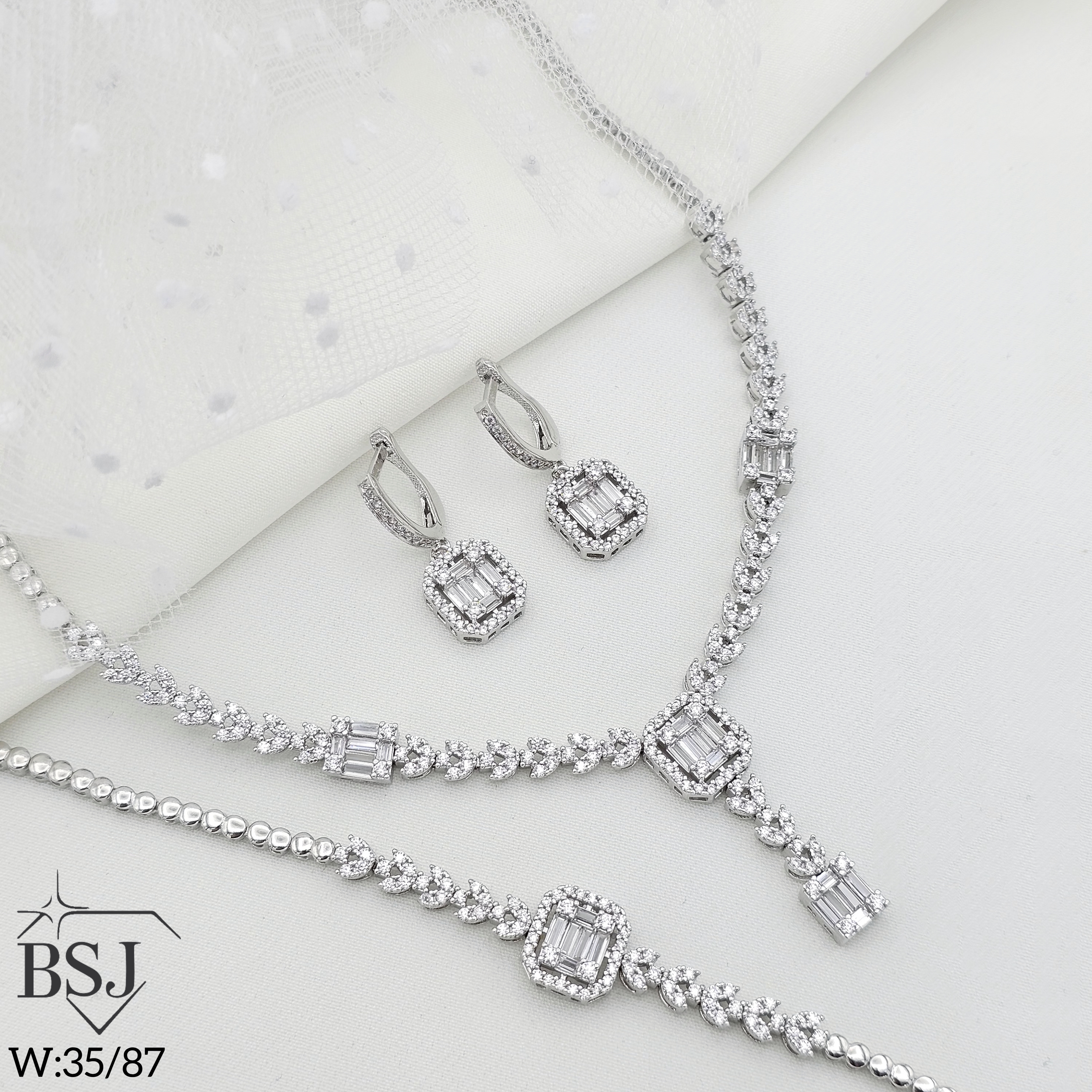 سرویس نقره جواهری زنانه BSJ_S614 از سرویس های مجلسی ساخته شده از نقره با عیار 925 می باشد.سنگ های به کار رفته در آن برلیان و از جنس اتمی زیرکونیا و نگین های امرالد می باشند که به صورت میکروستینگ مخراج کاری شده اند و در برابر ضربه مقاوم اند.آبکاری دو مرحله ای رودیوم (طلا سفید)، سبب کیفیت بی نظیر دوام رنگ آن شده است و به دلیل عدم استفاده از نیکل در ساختار آن، بدون حساسیت بوده و با پوست حساس سازگار است.به دلیل کیفیت فوق العاده و درخشش عالی سنگ ها، تفاوتی با نمونه طلا ندارد.وزن سرویس 35.87 گرم می باشد.