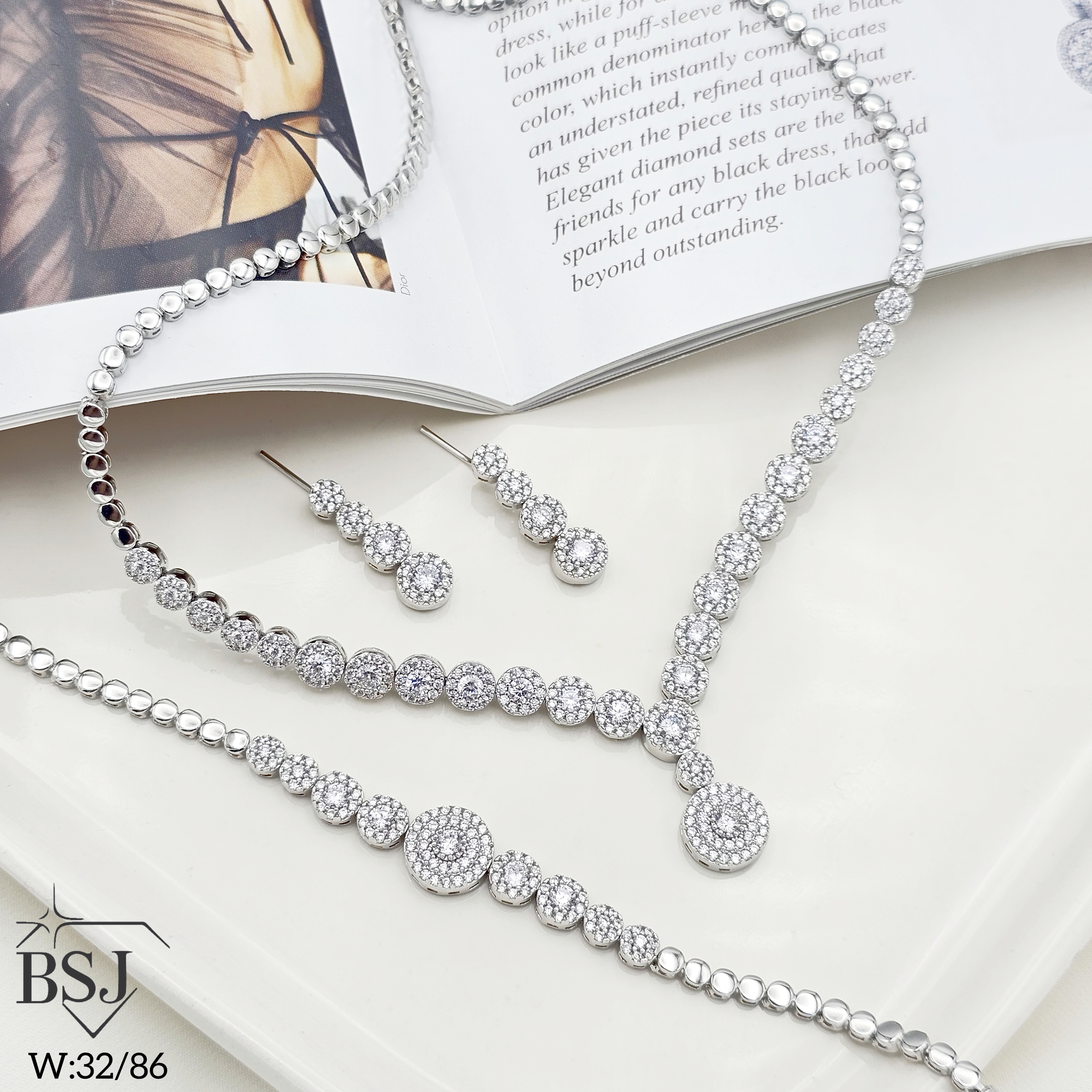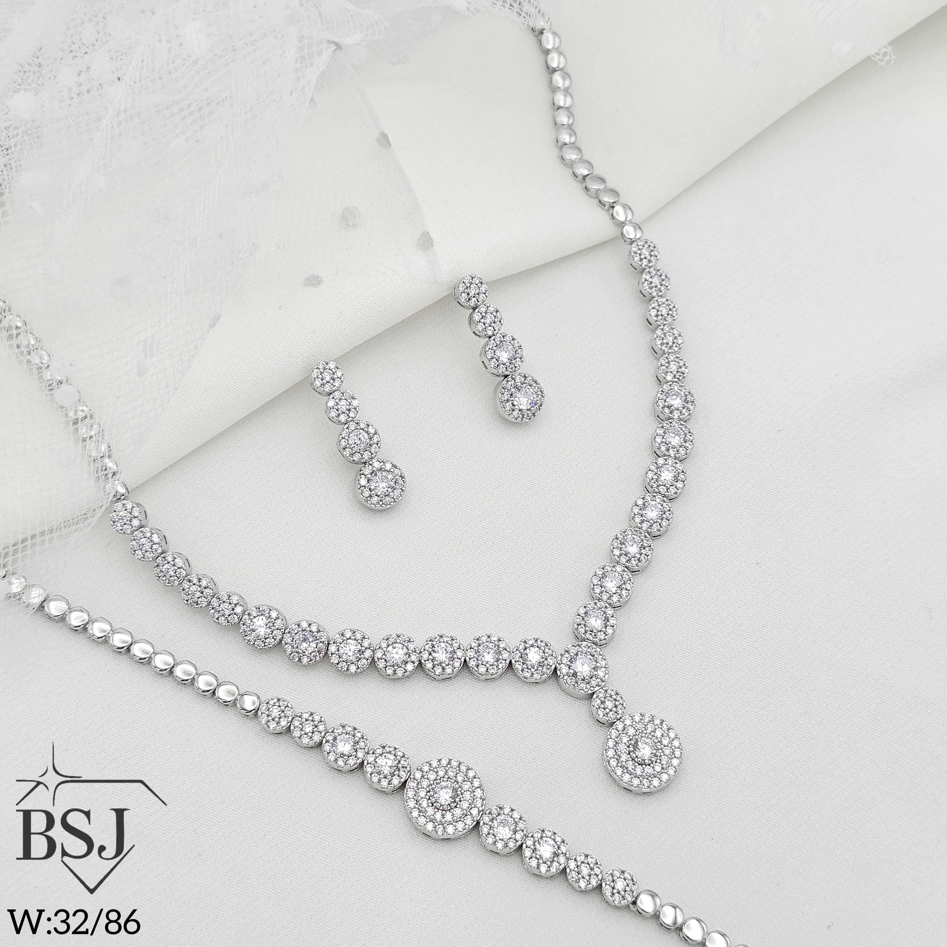 سرویس نقره جواهری زنانه BSJ_S615 از سرویس های مجلسی ساخته شده از نقره با عیار 925 می باشد.سنگ های به کار رفته در آن برلیان و از جنس اتمی زیرکونیا می باشند که به صورت میکروستینگ مخراج کاری شده اند و در برابر ضربه مقاوم اند.آبکاری دو مرحله ای رودیوم (طلا سفید)، سبب کیفیت بی نظیر دوام رنگ آن شده است و به دلیل عدم استفاده از نیکل در ساختار آن، بدون حساسیت بوده و با پوست حساس سازگار است.به دلیل کیفیت فوق العاده و درخشش عالی سنگ ها، تفاوتی با نمونه طلا ندارد.وزن سرویس32.86 گرم می باشد.