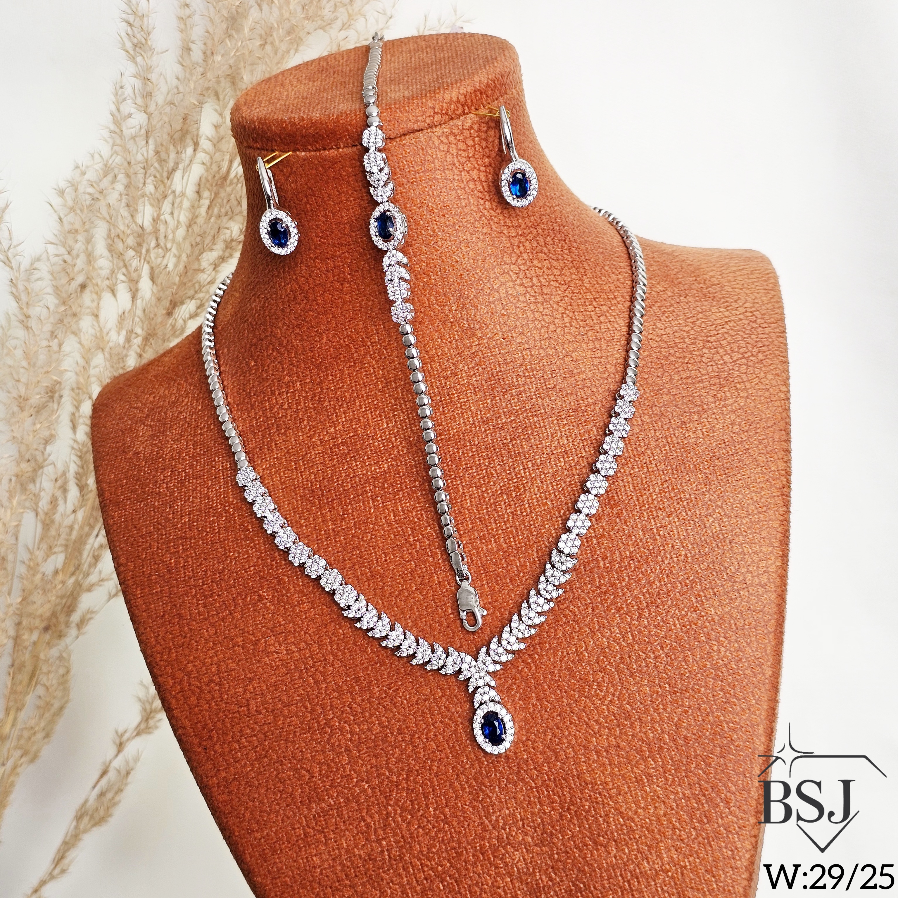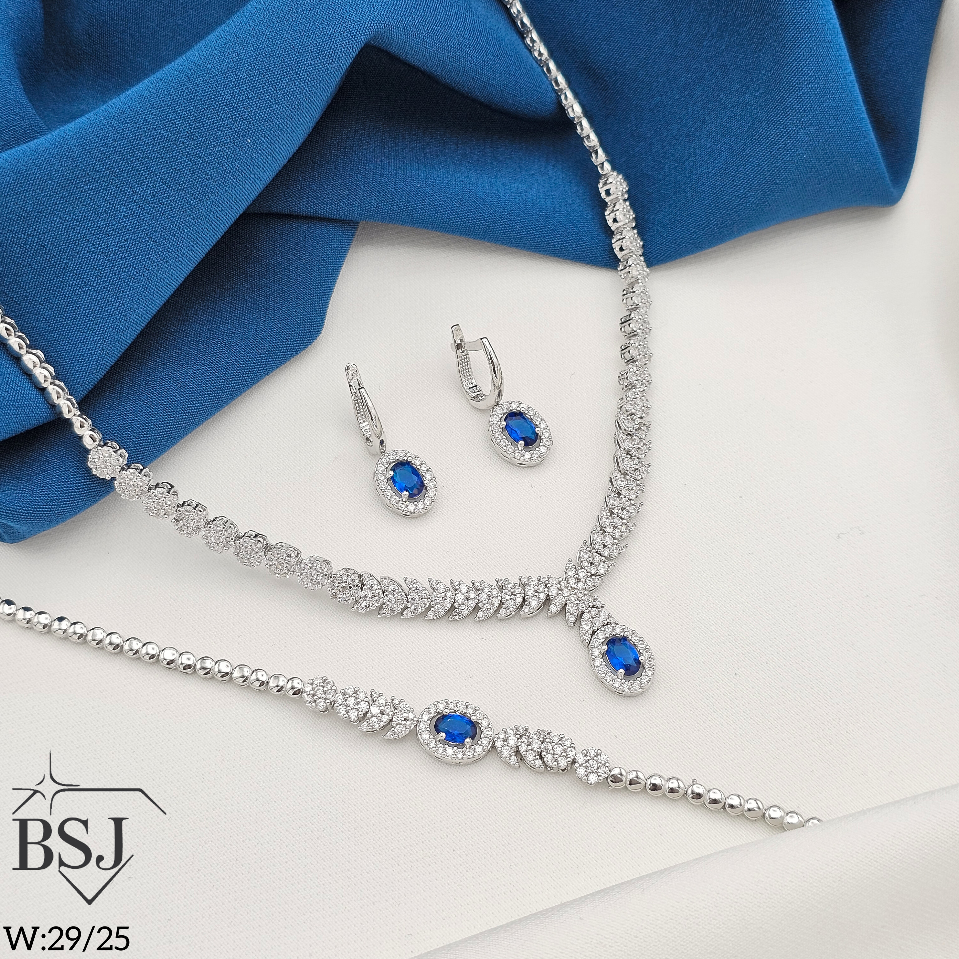 سرویس نقره جواهری زنانه BSJ_S621 از سرویس های شیک و لوکس ساخته شده از نقره با عیار 925 می باشد.سنگ های به کار رفته در آن برلیان و مارکیز از جنس اتمی زیرکونیا و سنگ های رنگی سنتتیک (آزمایشگاهی) می باشند که به صورت میکروستینگ مخراج کاری شده اند و در برابر ضربه مقاوم اند.آبکاری دو مرحله ای رودیوم (طلا سفید)، سبب کیفیت بی نظیر دوام رنگ آن شده است و به دلیل عدم استفاده از نیکل در ساختار آن،بدون حساسیت بوده و با پوست حساس سازگار است.به دلیل کیفیت فوق العاده و درخشش عالی سنگ ها، تفاوتی با نمونه طلا ندارد.وزن سرویس 29.25 گرم می باشد.