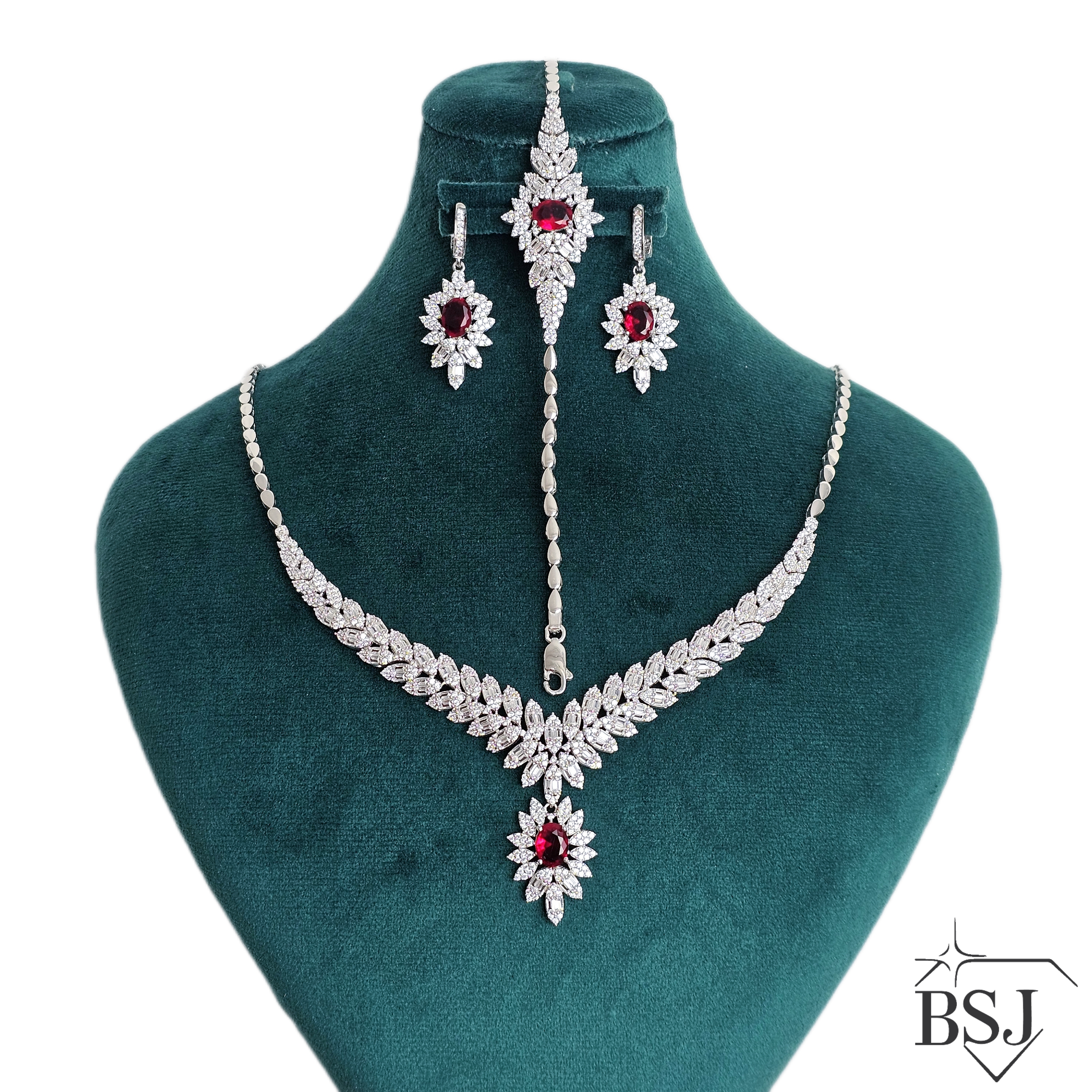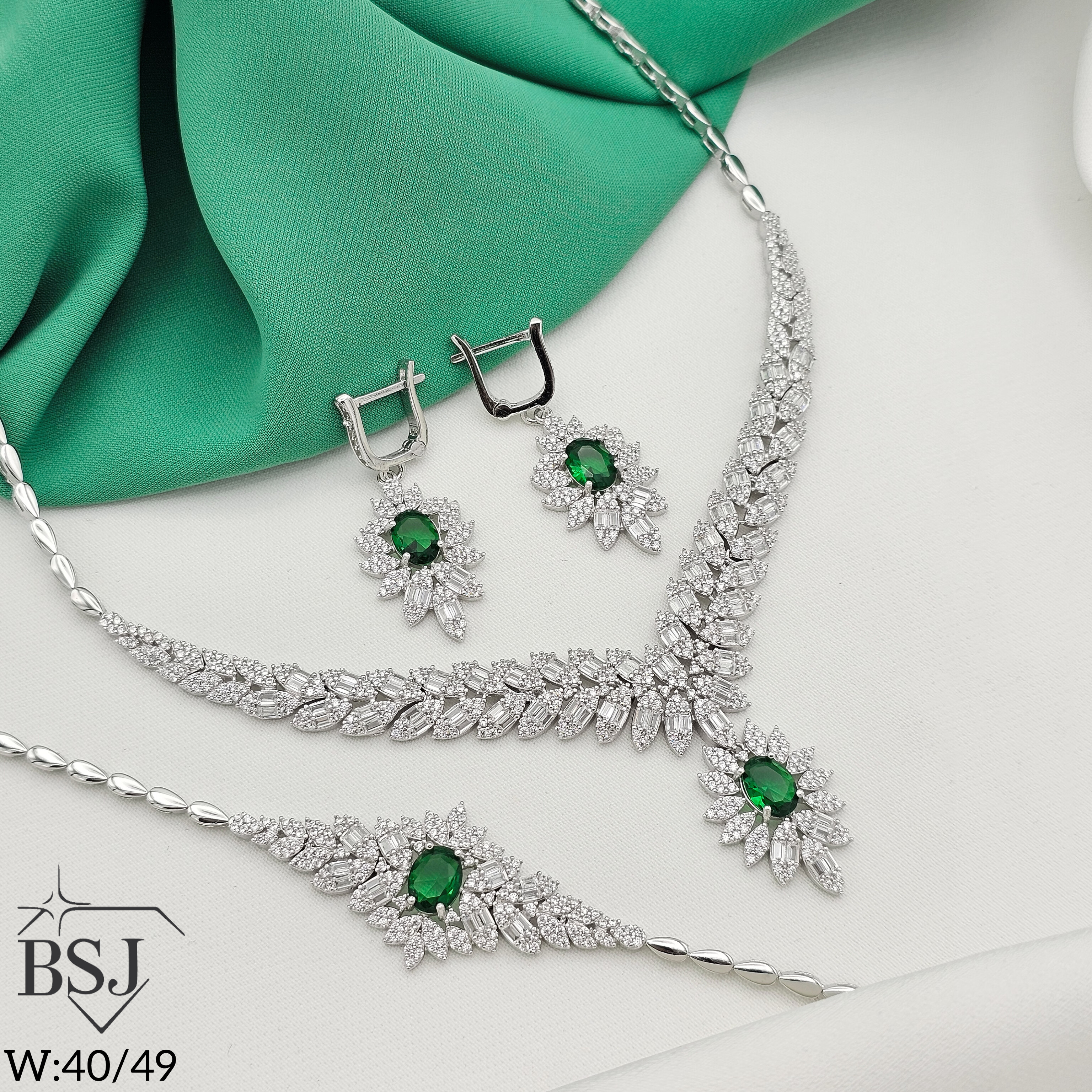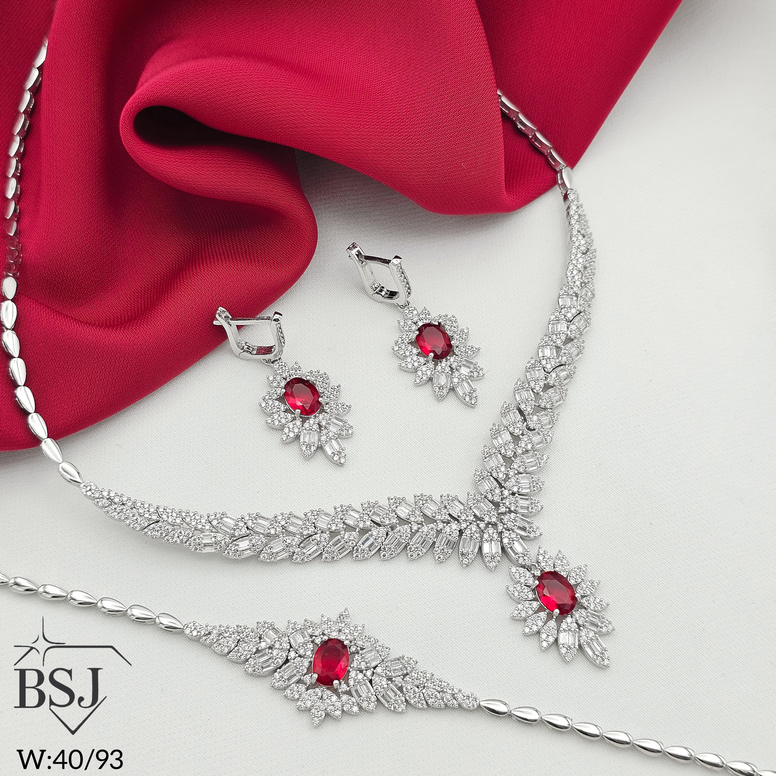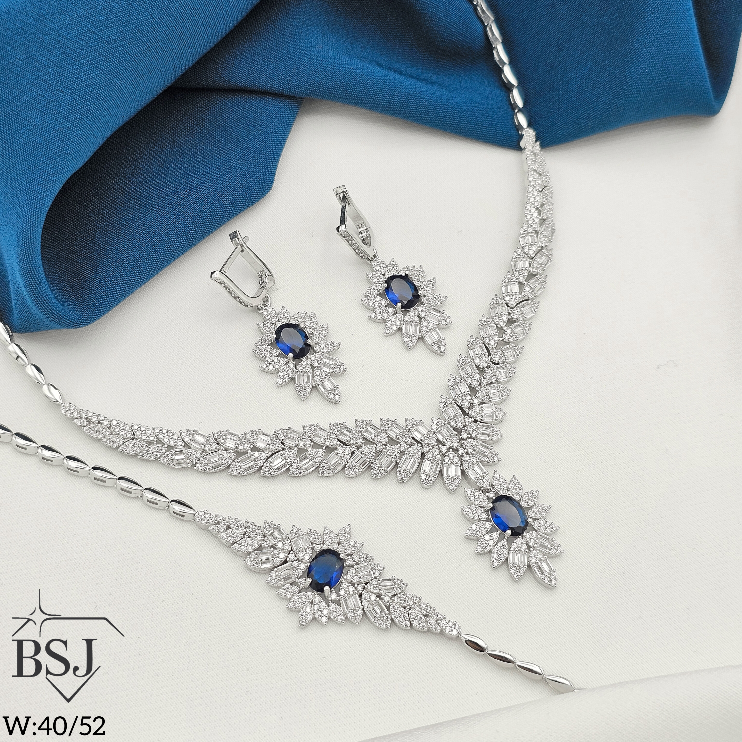 سرویس نقره جواهری زنانه BSJ_S622 از سرویس های شیک و لوکس ساخته شده از نقره با عیار 925 می باشد.سنگ های به کار رفته در آن برلیان و مارکیز از جنس اتمی زیرکونیا و سنگ های رنگی سنتتیک (آزمایشگاهی) می باشند که به صورت میکروستینگ مخراج کاری شده اند و در برابر ضربه مقاوم اند.آبکاری دو مرحله ای رودیوم (طلا سفید)، سبب کیفیت بی نظیر دوام رنگ آن شده است و به دلیل عدم استفاده از نیکل در ساختار آن،بدون حساسیت بوده و با پوست حساس سازگار است.به دلیل کیفیت فوق العاده و درخشش عالی سنگ ها، تفاوتی با نمونه طلا ندارد.وزن سرویس40.52 گرم می باشد.