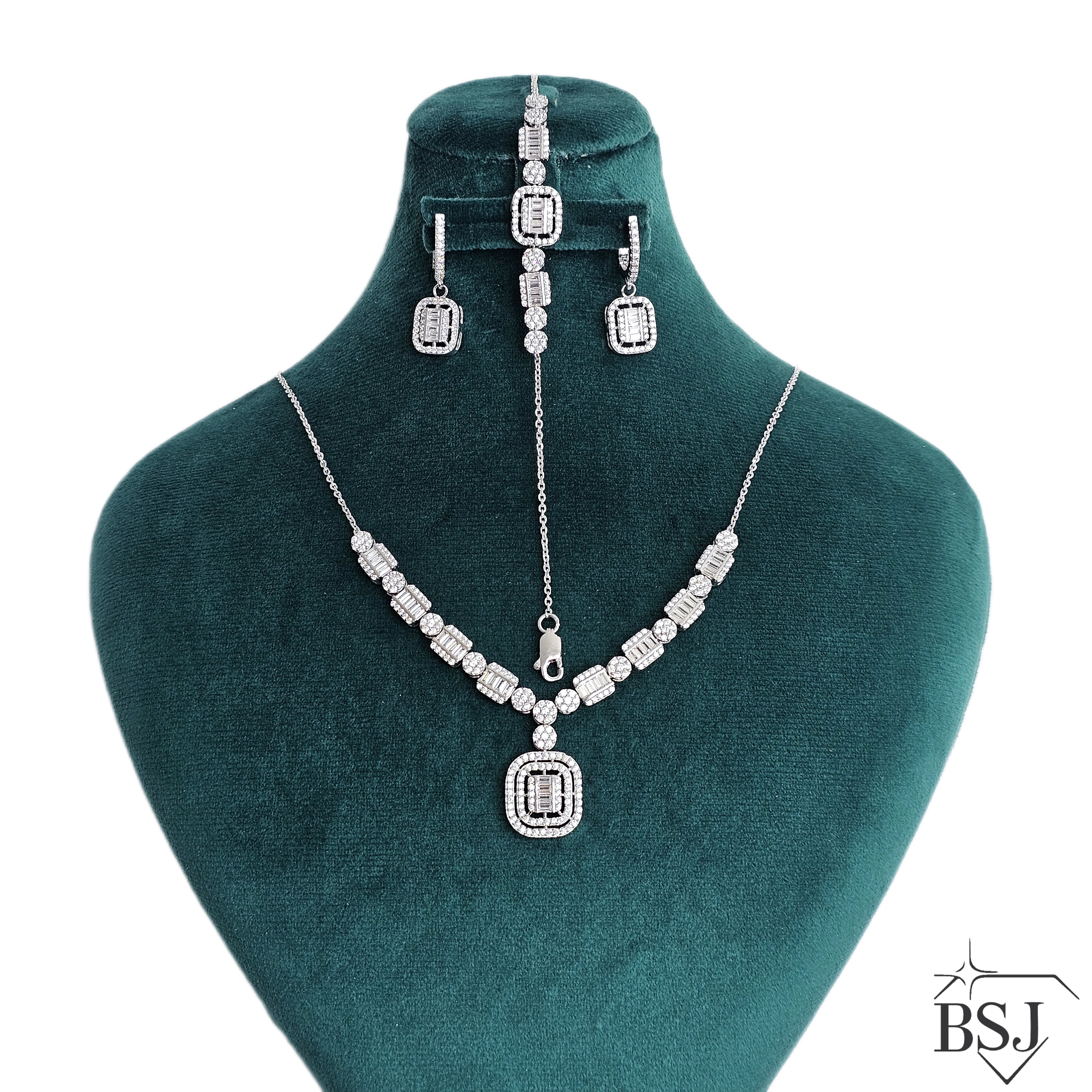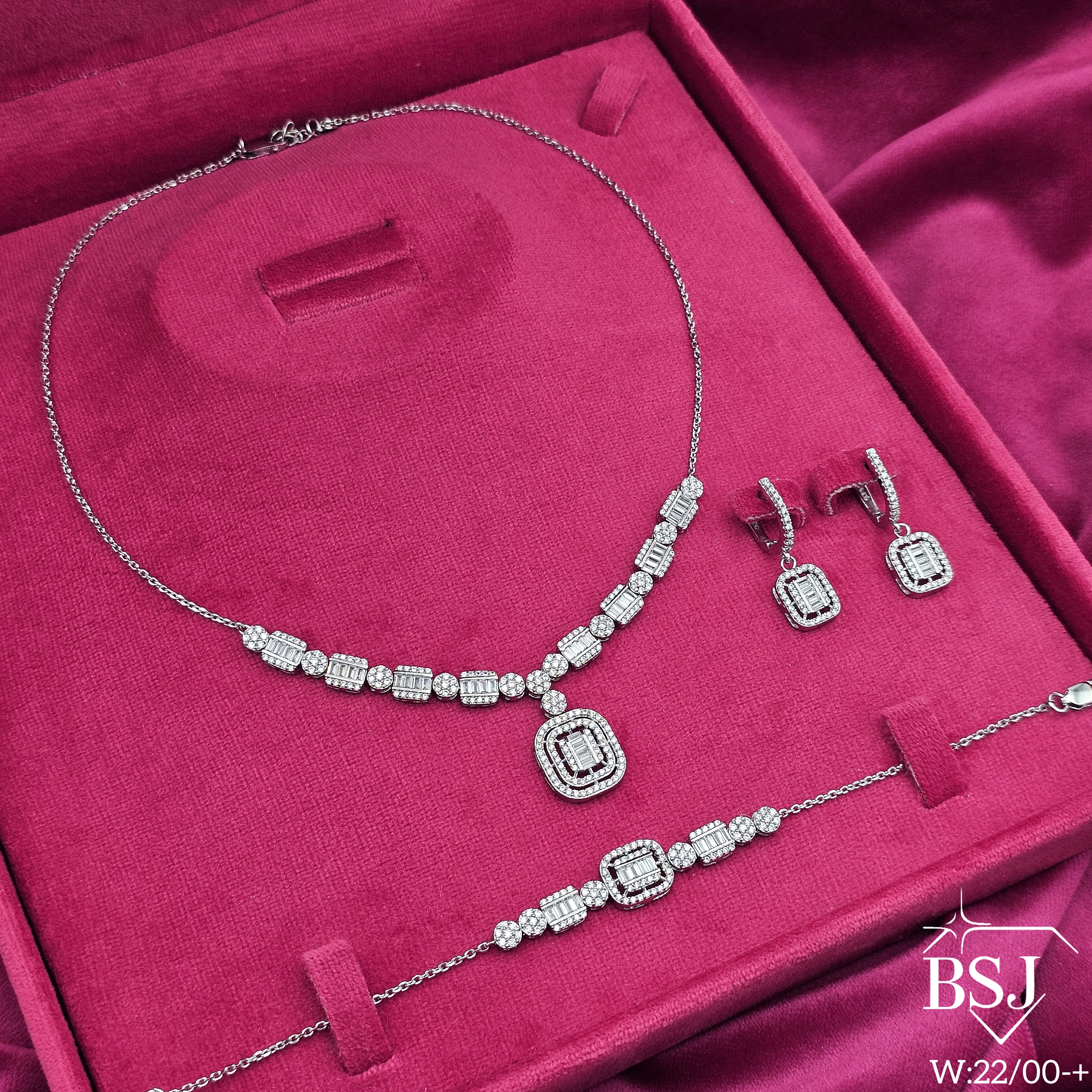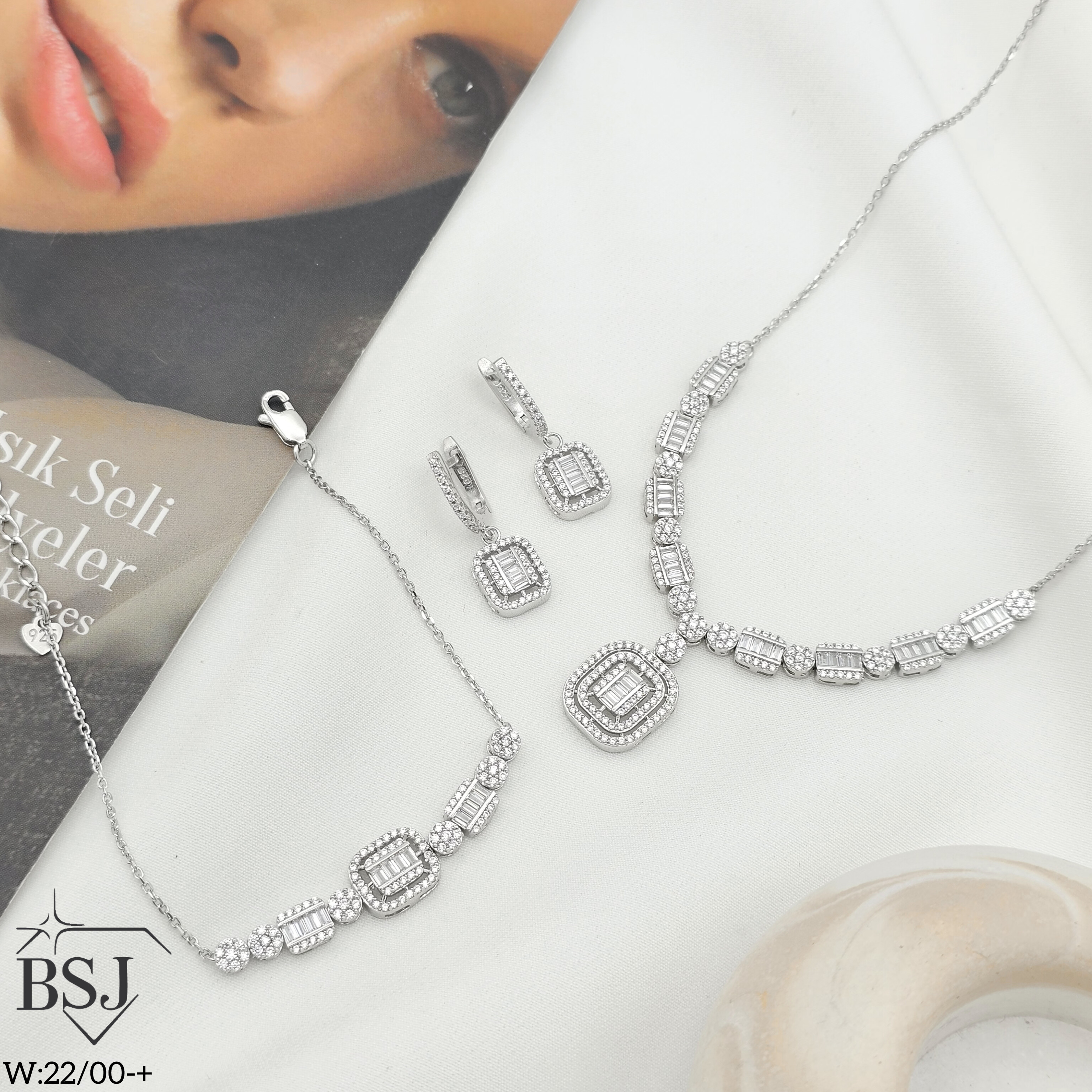 سرویس نقره زنجیری زنانه BSJ_S624 از سرویس های مجلسی ساخته شده از نقره با عیار 925 می باشد.سنگ های به کار رفته در آن برلیان و از جنس اتمی زیرکونیا و نگین های امرالد می باشند که به صورت میکروستینگ مخراج کاری شده اند و در برابر ضربه مقاوم اند.آبکاری دو مرحله ای رودیوم (طلا سفید)، سبب کیفیت بی نظیر دوام رنگ آن شده است و به دلیل عدم استفاده از نیکل در ساختار آن، بدون حساسیت بوده و با پوست حساس سازگار است.به دلیل کیفیت فوق العاده و درخشش عالی سنگ ها، تفاوتی با نمونه طلا ندارد.وزن سرویس 22.00 گرم می باشد.