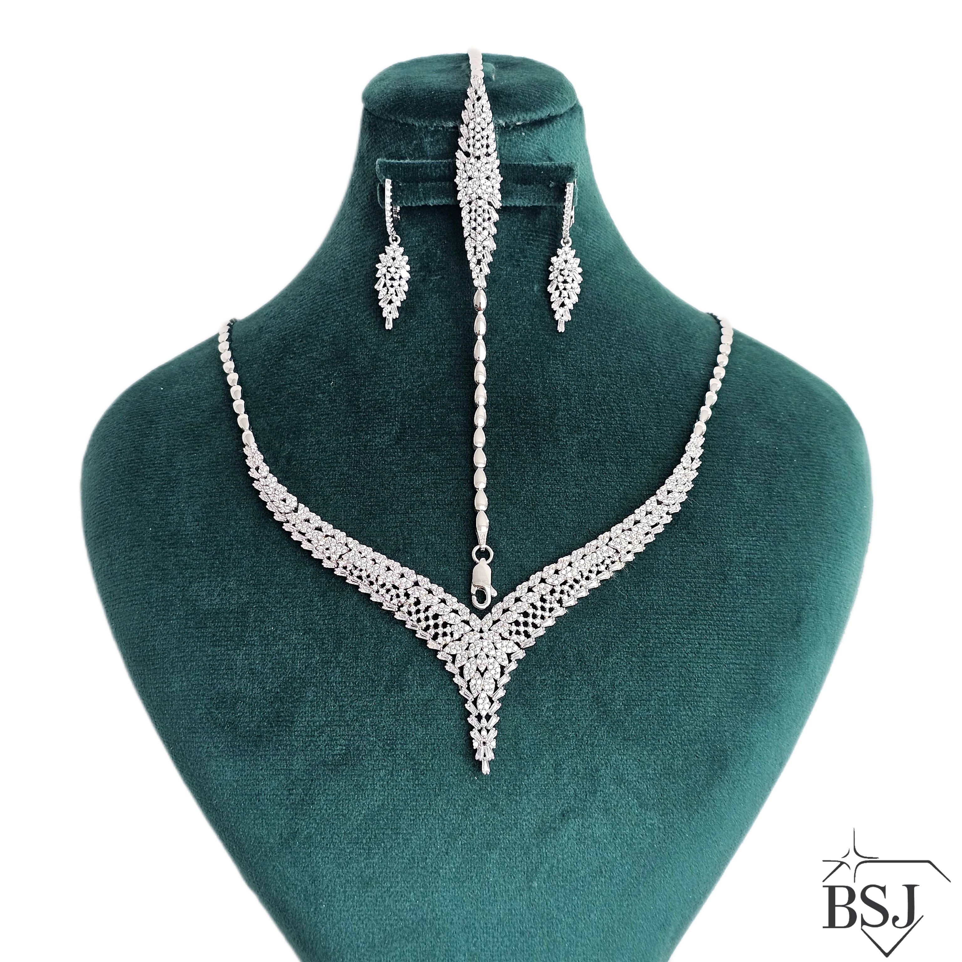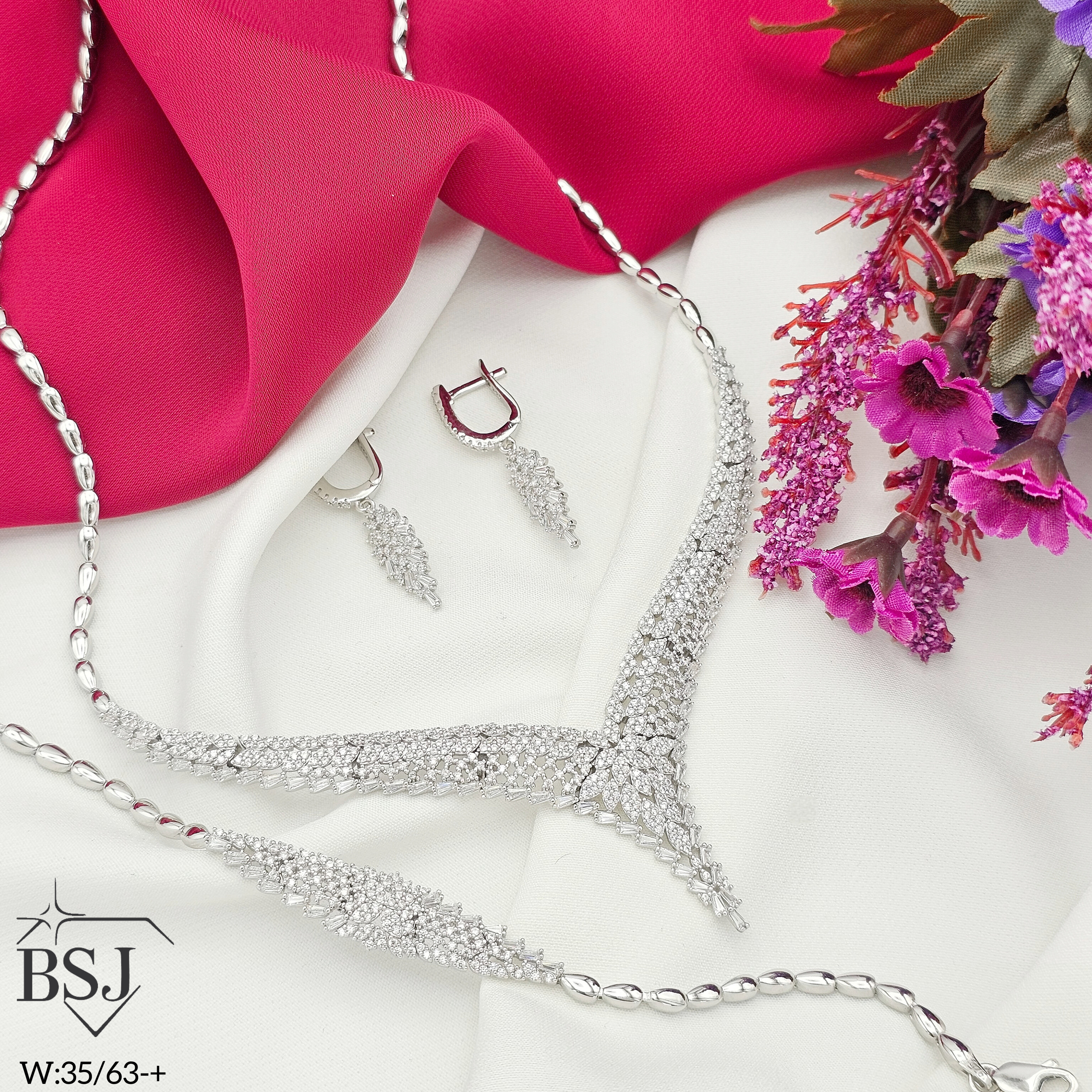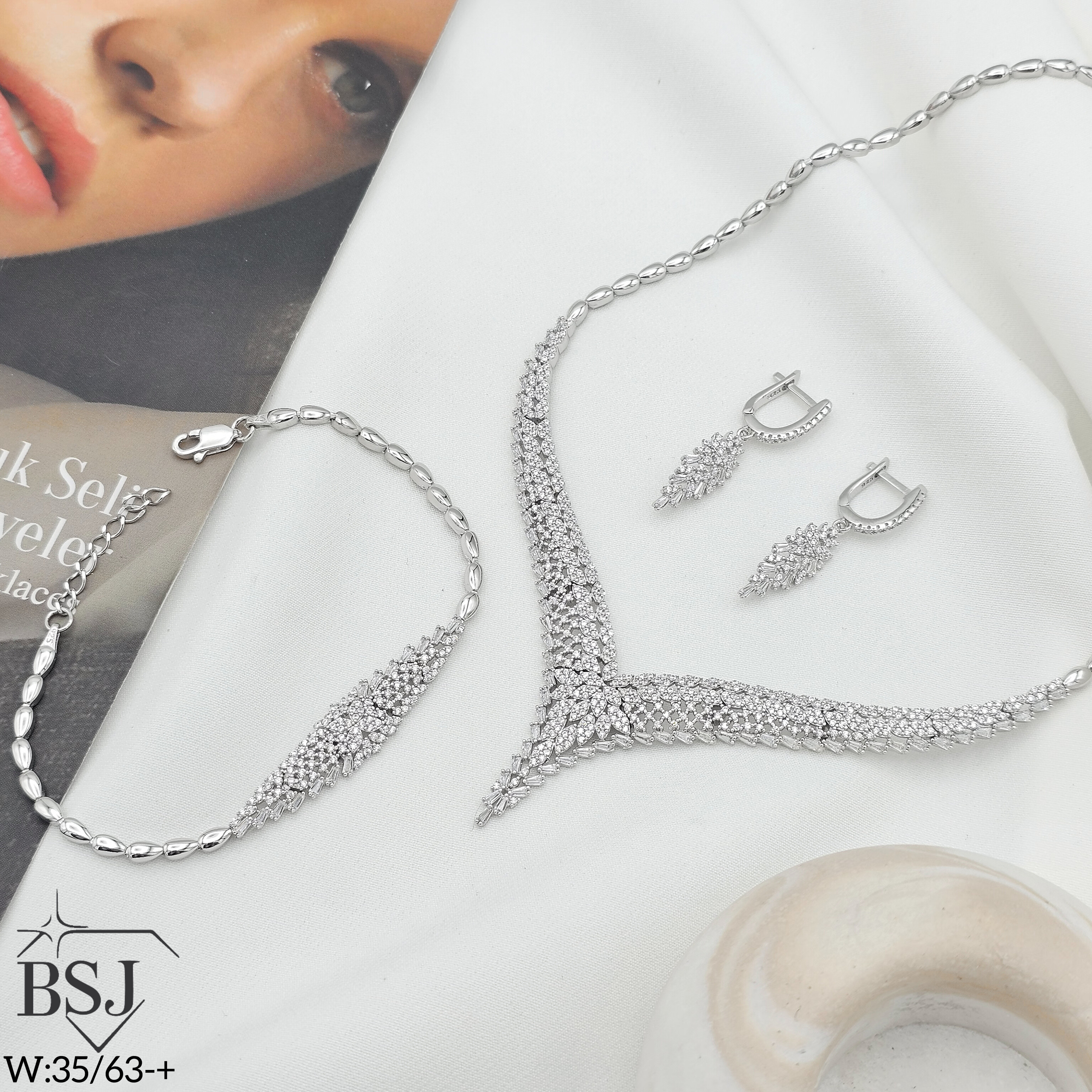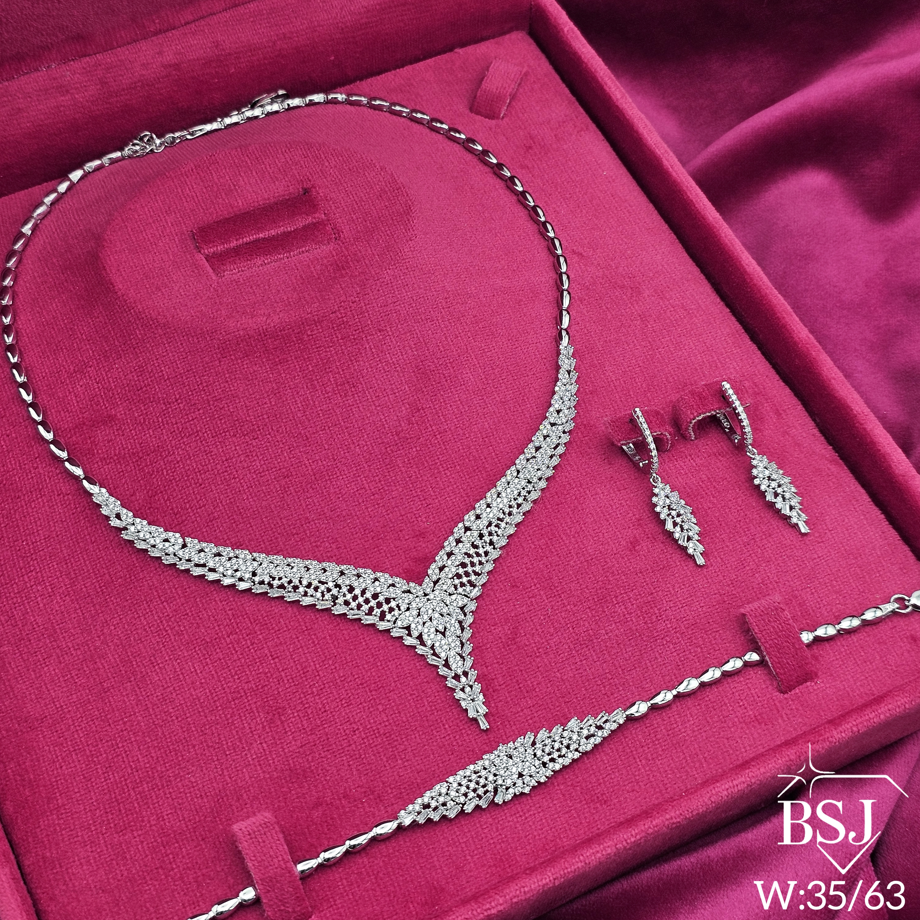 سرویس نقره جواهری زنانه BSJ_S625 از سرویس های اعیانی ساخته شده از نقره با عیار 925 می باشد.سنگ های به کار رفته در آن برلیان از جنس اتمی زیرکونیا می باشند که به صورت میکروستینگ مخراج کاری شده اند و در برابر ضربه مقاوم اند.آبکاری دو مرحله ای رودیوم (طلا سفید)، سبب کیفیت بی نظیر دوام رنگ آن شده است و به دلیل عدم استفاده از نیکل در ساختار آن، بدون حساسیت بوده و با پوست حساس سازگار است.به دلیل کیفیت فوق العاده و درخشش عالی سنگ ها، تفاوتی با نمونه طلا ندارد.وزن سرویس +- 35.63 گرم می باشد.