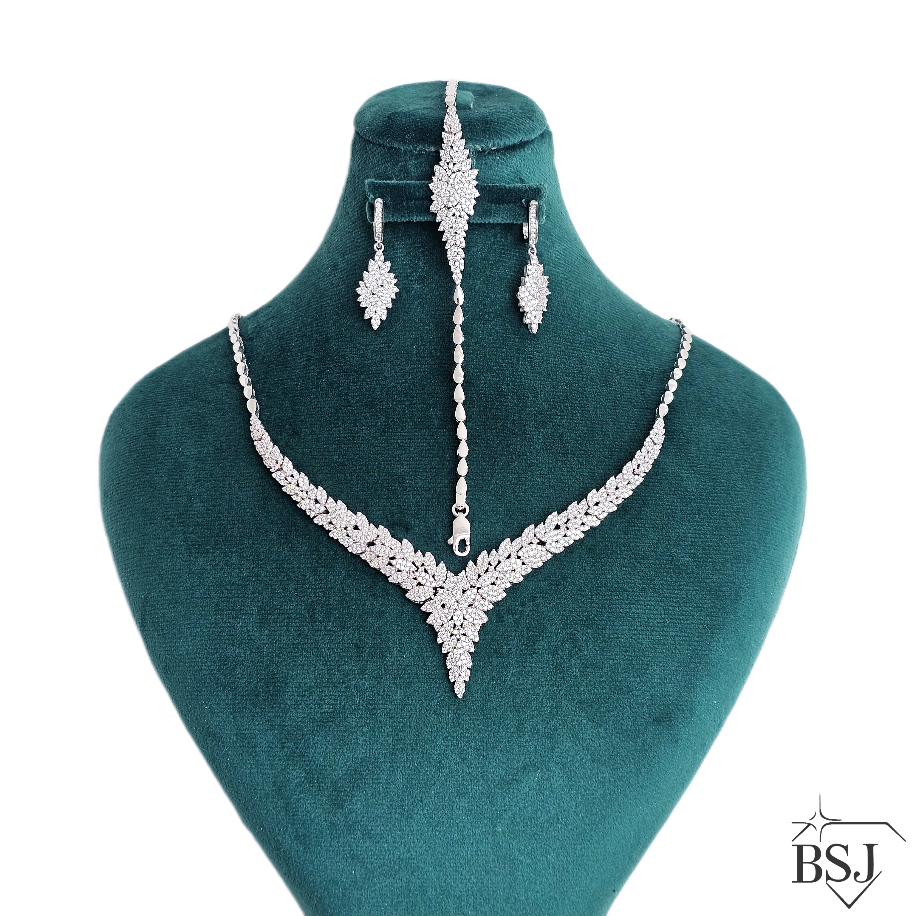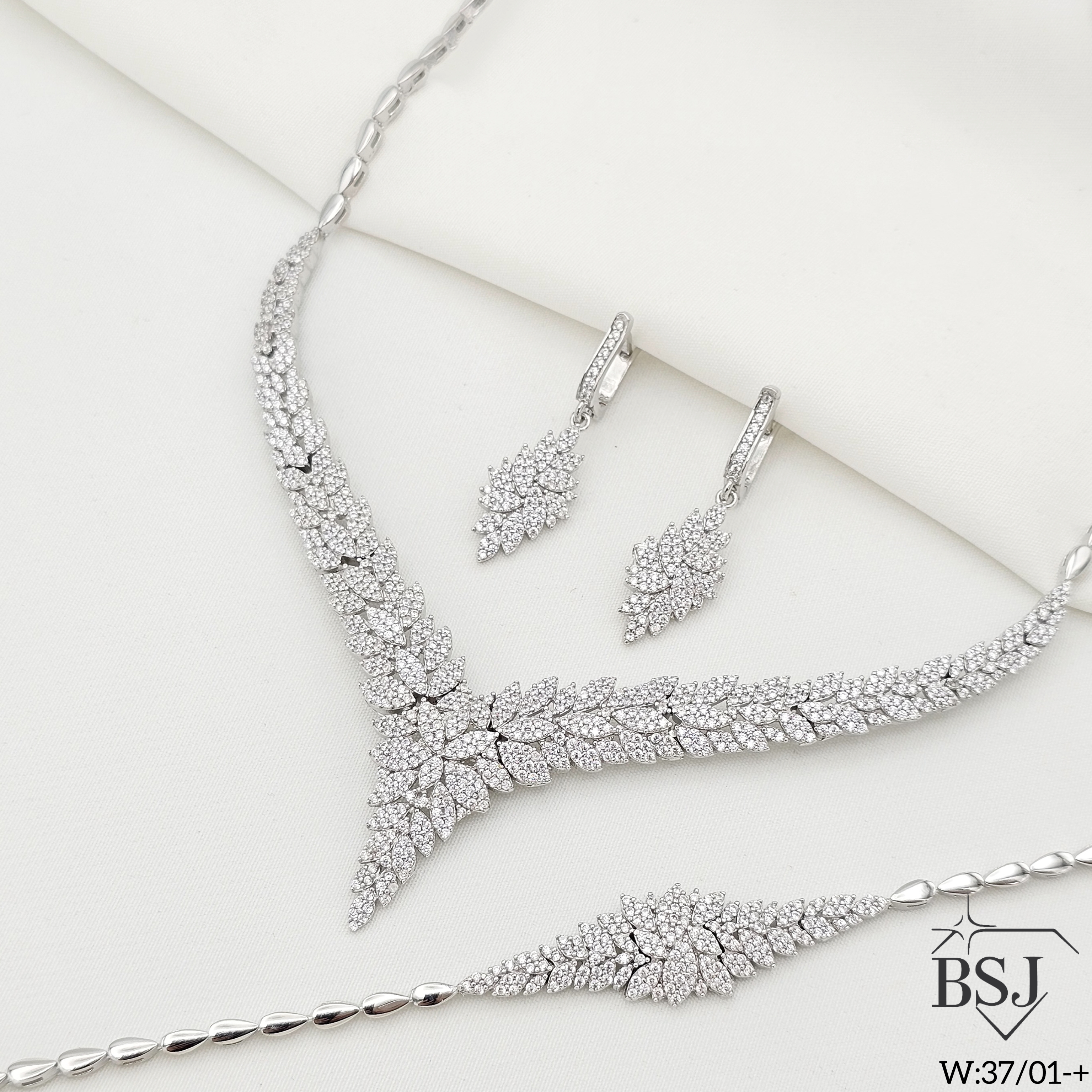 سرویس نقره جواهری زنانه BSJ_S628 از سرویس های اعیانی ساخته شده از نقره با عیار 925 می باشد.سنگ های به کار رفته در آن برلیان از جنس اتمی زیرکونیا می باشند که به صورت میکروستینگ مخراج کاری شده اند و در برابر ضربه مقاوم اند.آبکاری دو مرحله ای رودیوم (طلا سفید)، سبب کیفیت بی نظیر دوام رنگ آن شده است و به دلیل عدم استفاده از نیکل در ساختار آن، بدون حساسیت بوده و با پوست حساس سازگار است.به دلیل کیفیت فوق العاده و درخشش عالی سنگ ها، تفاوتی با نمونه طلا ندارد.وزن سرویس +- 37.01 گرم می باشد.