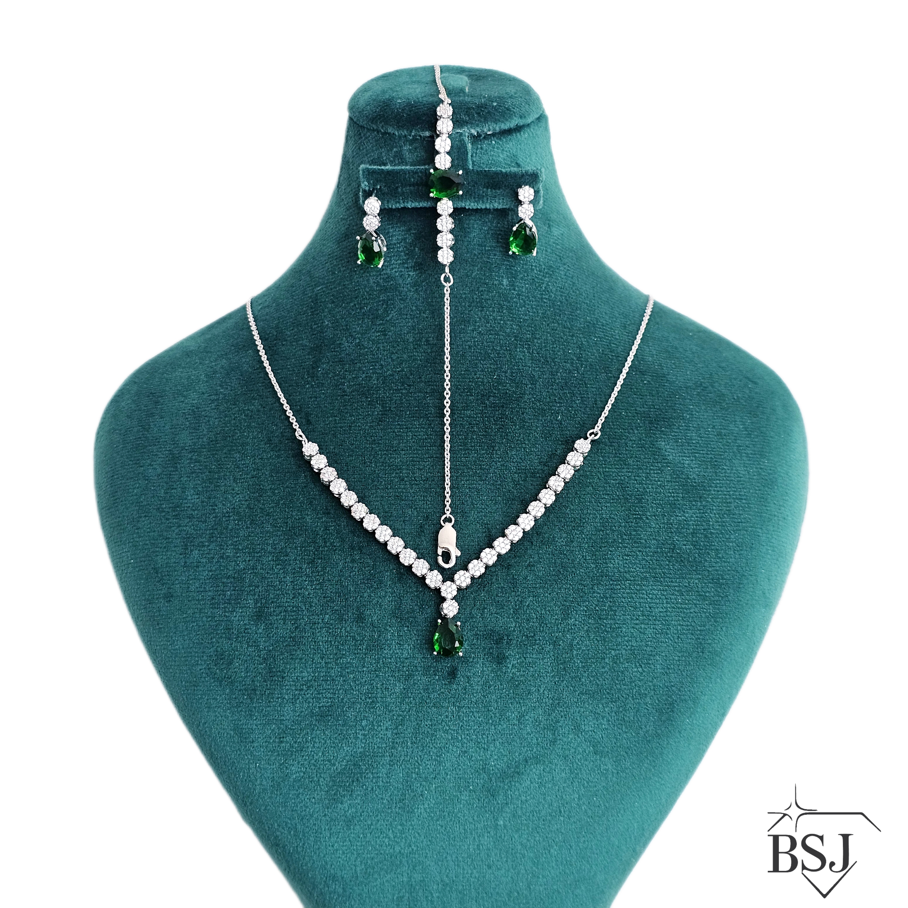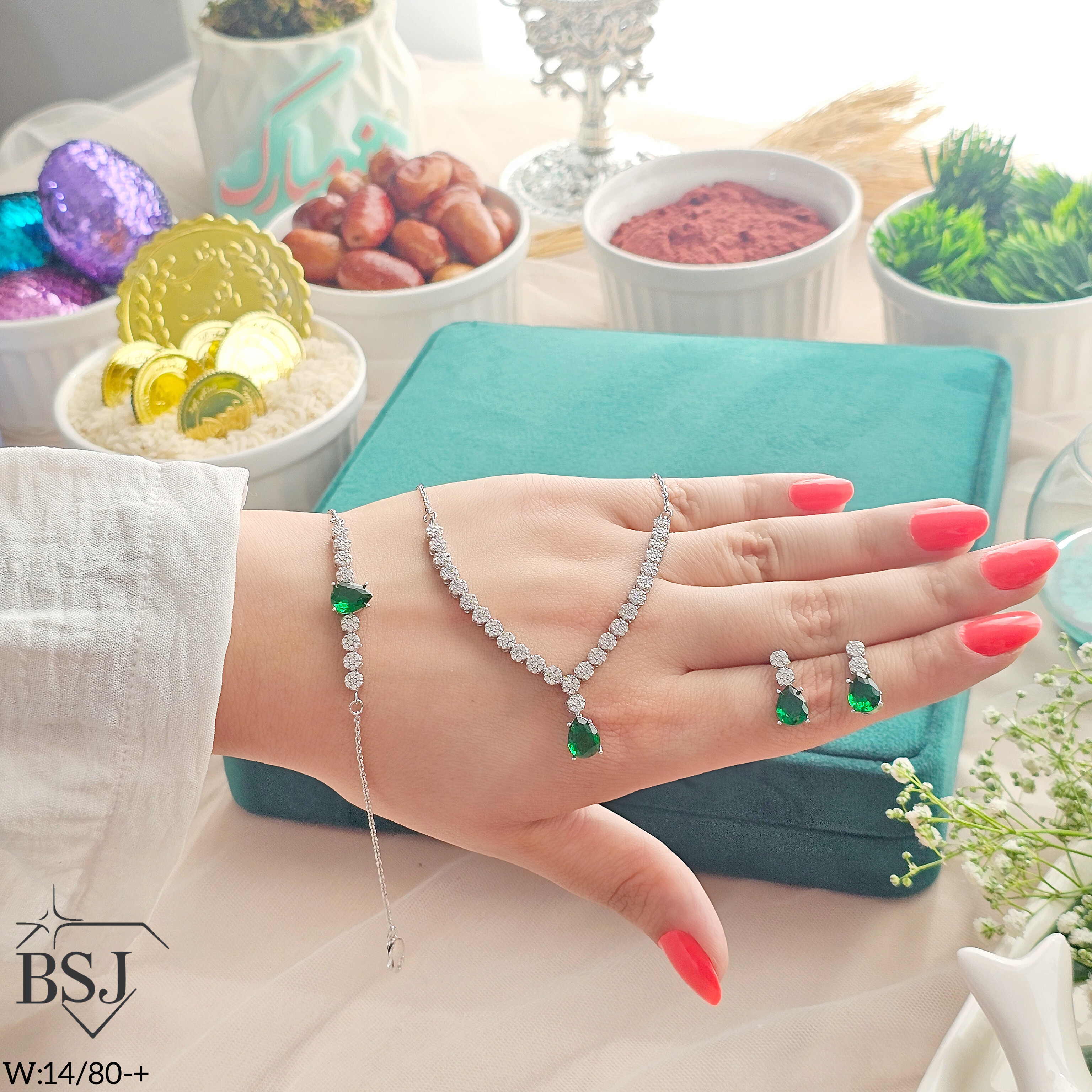 سرویس نقره زنجیری زنانه BSJ_S631 از سرویس های مجلسی ساخته شده از نقره با عیار 925 می باشد.سنگ های به کار رفته در آن برلیان و از جنس اتمی زیرکونیا و سنگ های زمرد سنتتیک (آزمایشگاهی) می باشند که به صورت میکروستینگ مخراج کاری شده اند و در برابر ضربه مقاوم اند.آبکاری دو مرحله ای رودیوم (طلا سفید)، سبب کیفیت بی نظیر دوام رنگ آن شده است و به دلیل عدم استفاده از نیکل در ساختار آن، بدون حساسیت بوده و با پوست حساس سازگار است.به دلیل کیفیت فوق العاده و درخشش عالی سنگ ها، تفاوتی با نمونه طلا ندارد.وزن سرویس 14.80 گرم می باشد.
