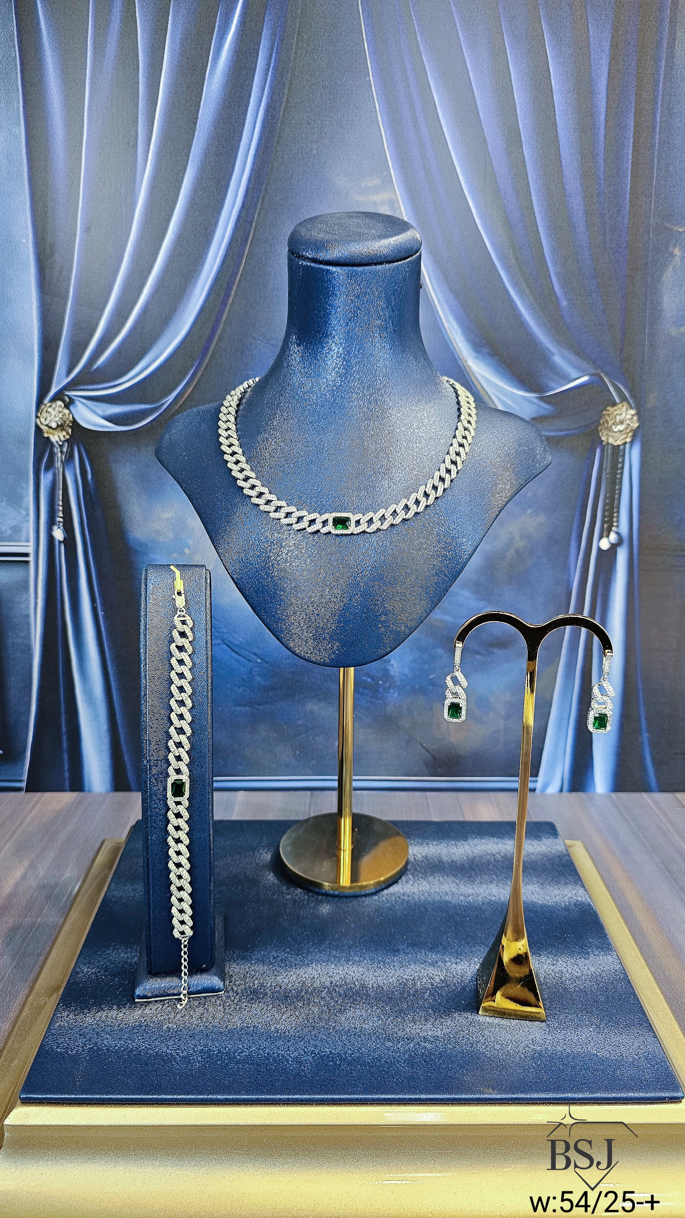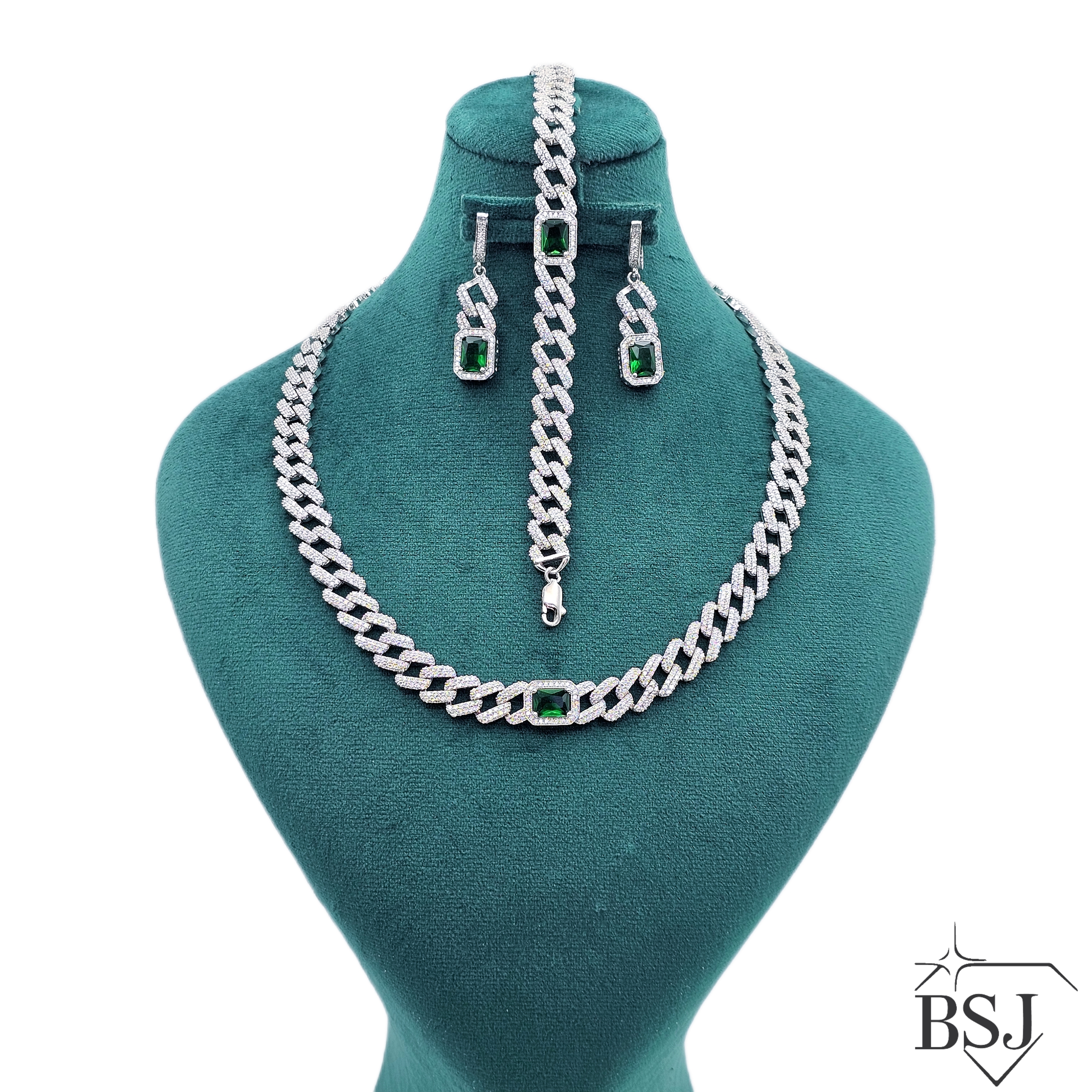 سرویس نقره جواهری زنانه BSJ_S641 از سرویس های شیک و لوکس و طرح کارتیه ساخته شده از نقره با عیار 925 می باشد.سنگ های به کار رفته در آن برلیان از جنس اتمی زیرکونیا و سنگ های سنتتیک (آزمایشگاهی) به رنگ سبز می باشند که به صورت میکروستینگ مخراج کاری شده اند و در برابر ضربه مقاوم اند.آبکاری دو مرحله ای رودیوم (طلا سفید)، سبب کیفیت بی نظیر دوام رنگ آن شده است و به دلیل عدم استفاده از نیکل در ساختار آن،بدون حساسیت بوده و با پوست حساس سازگار است.به دلیل کیفیت فوق العاده و درخشش عالی سنگ ها، تفاوتی با نمونه طلا ندارد.وزن سرویس +-54.25 گرم می باشد.