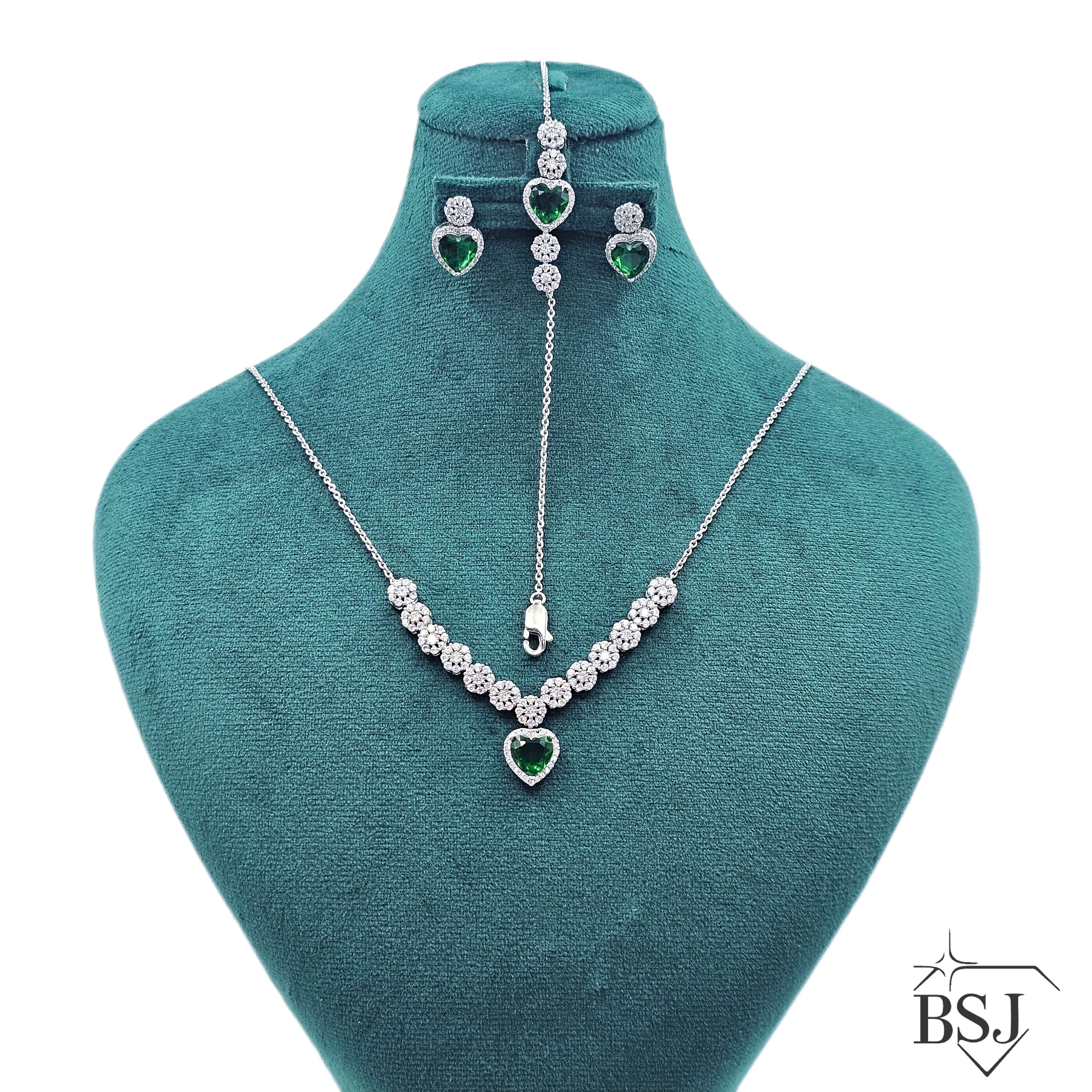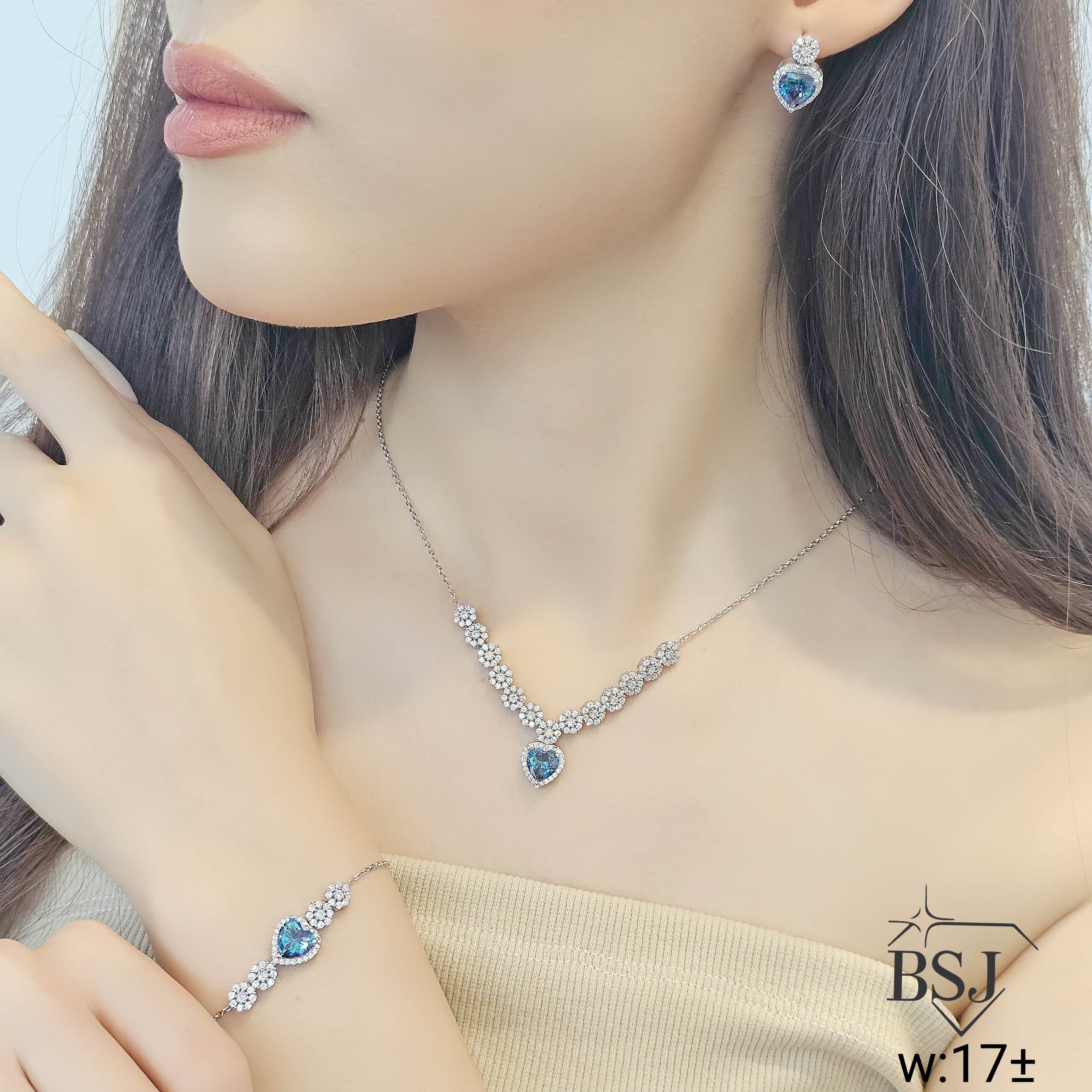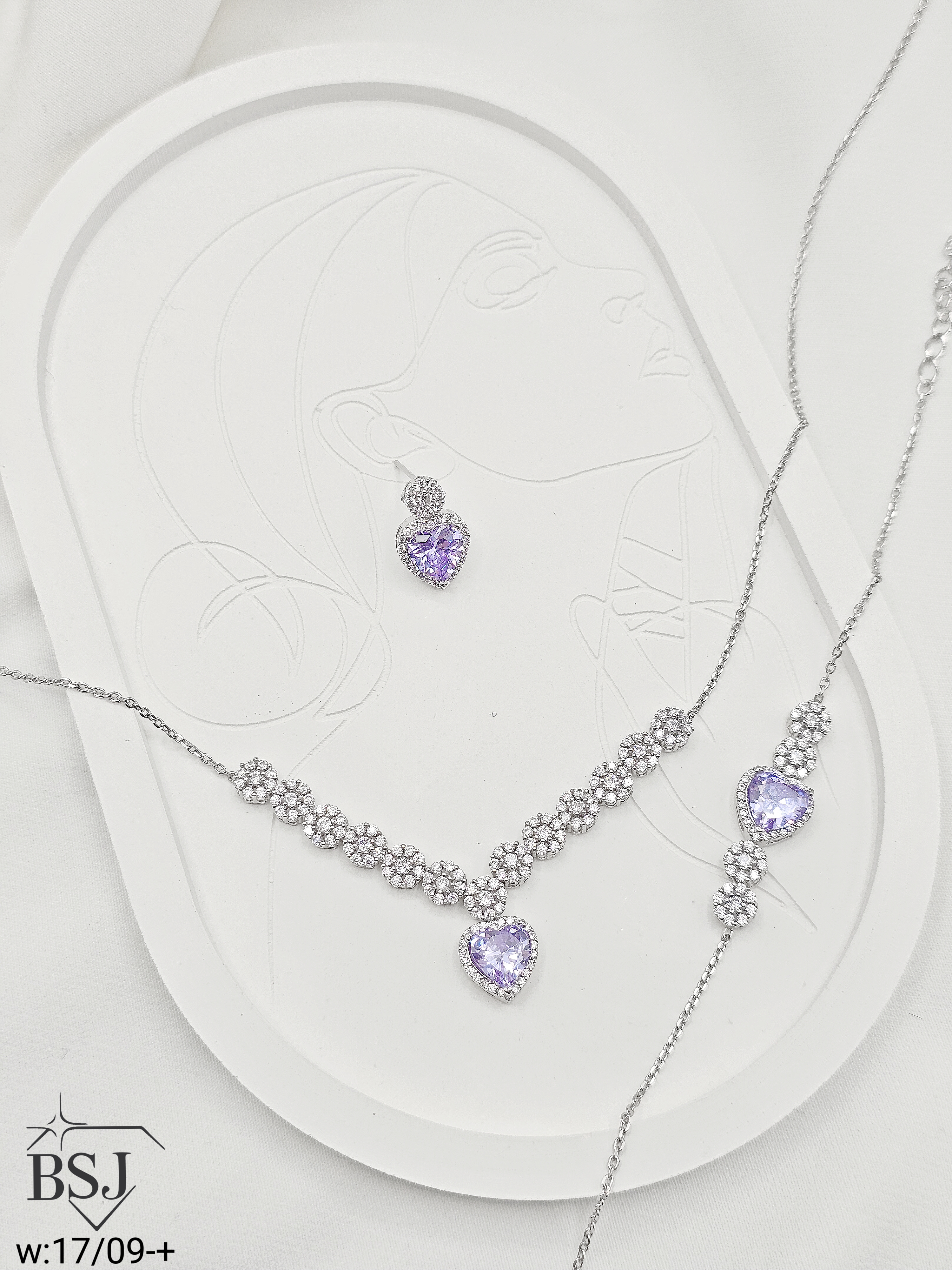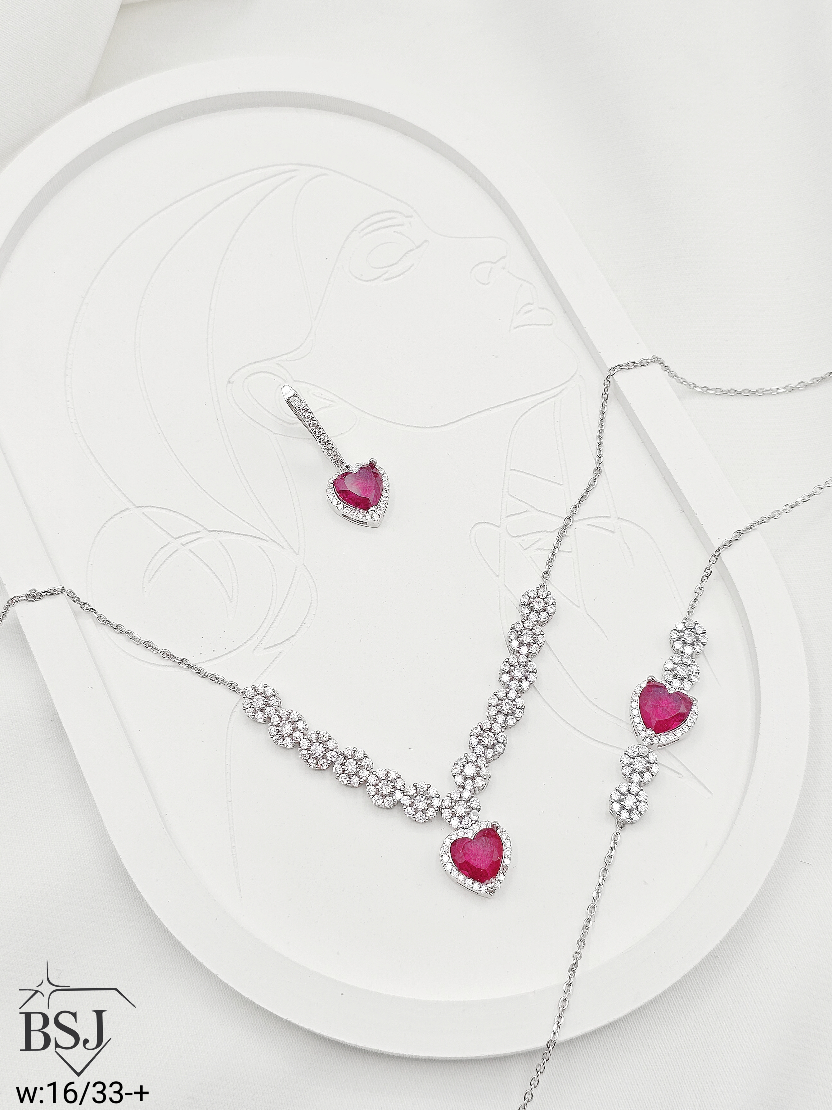 سرویس نقره جواهری زنانه BSJ_S645 طرح قلب از سرویس های شیک و لوکس ساخته شده از نقره با عیار 925 می باشد.سنگ های به کار رفته در آن برلیان و مارکیز از جنس اتمی زیرکونیا و سنگ های رنگی سنتتیک (آزمایشگاهی) می باشند که به صورت میکروستینگ مخراج کاری شده اند و در برابر ضربه مقاوم اند.آبکاری دو مرحله ای رودیوم (طلا سفید)، سبب کیفیت بی نظیر دوام رنگ آن شده است و به دلیل عدم استفاده از نیکل در ساختار آن،بدون حساسیت بوده و با پوست حساس سازگار است.به دلیل کیفیت فوق العاده و درخشش عالی سنگ ها، تفاوتی با نمونه طلا ندارد.وزن سرویس 17.09+- گرم می باشد.