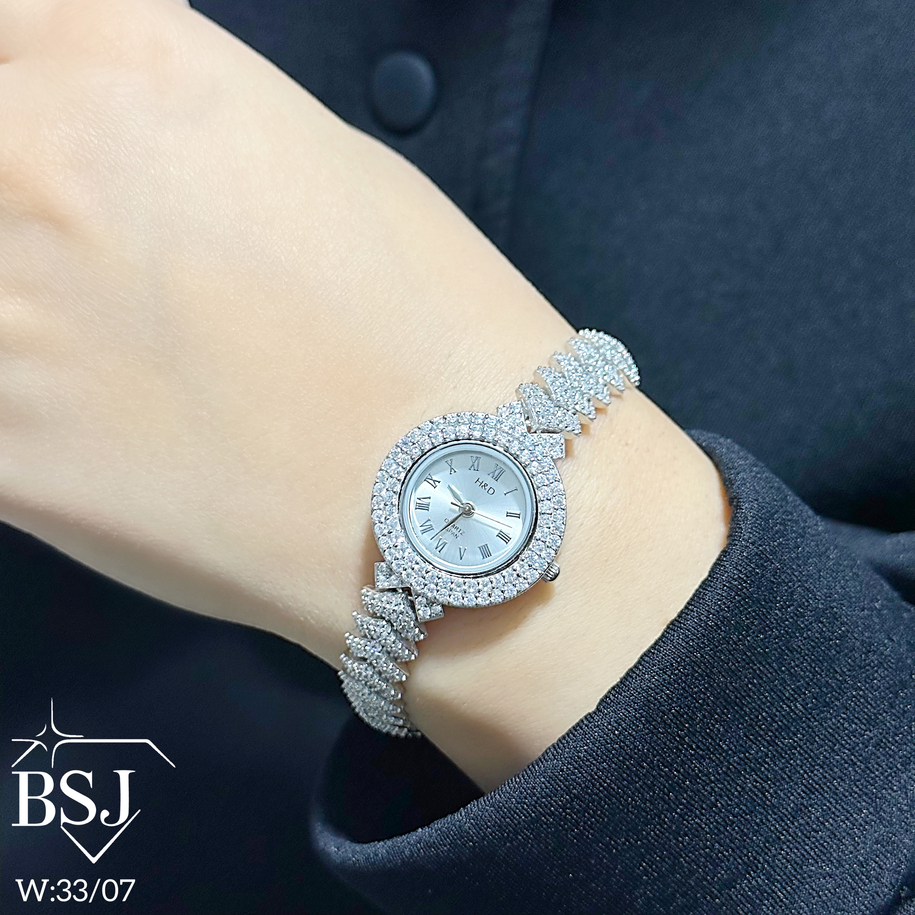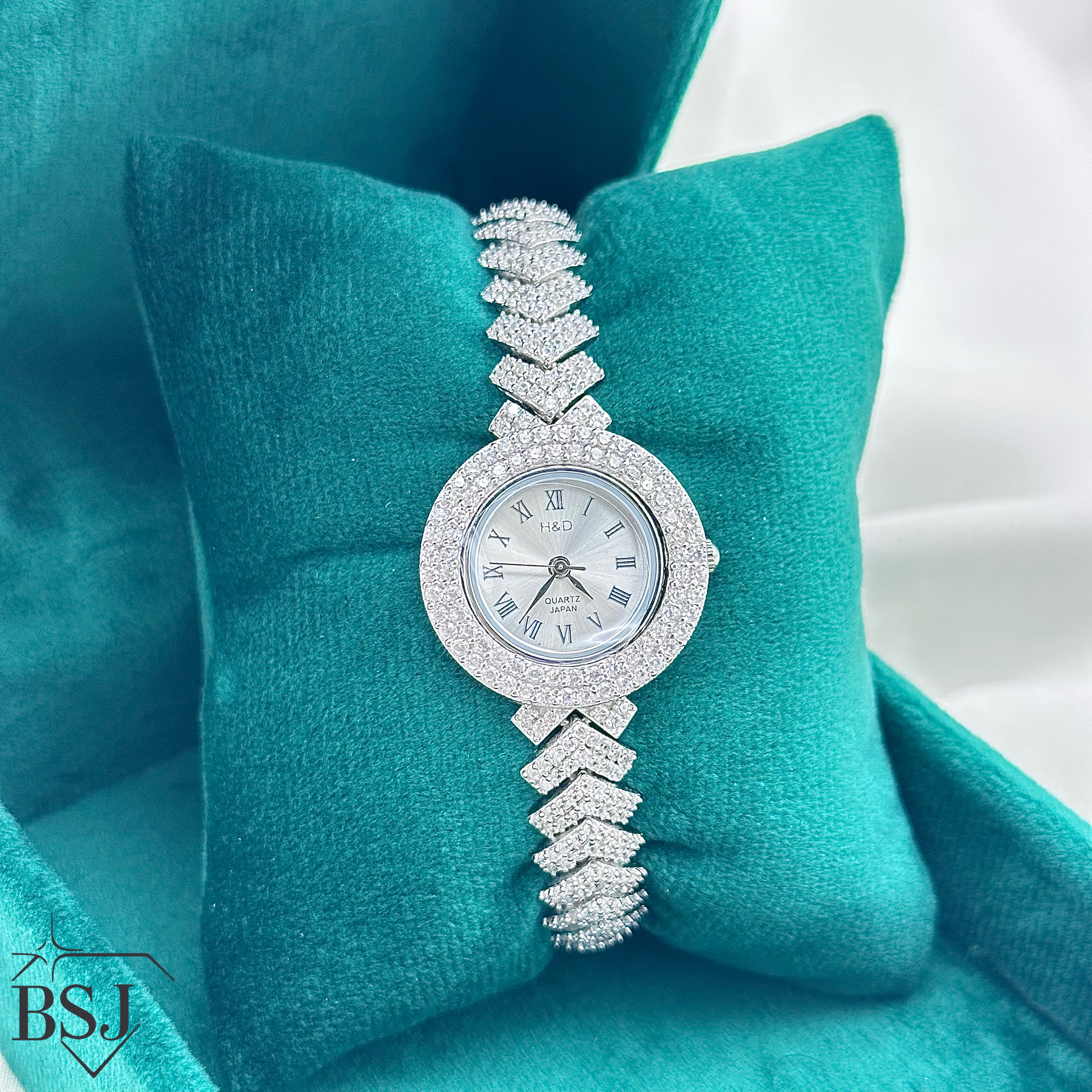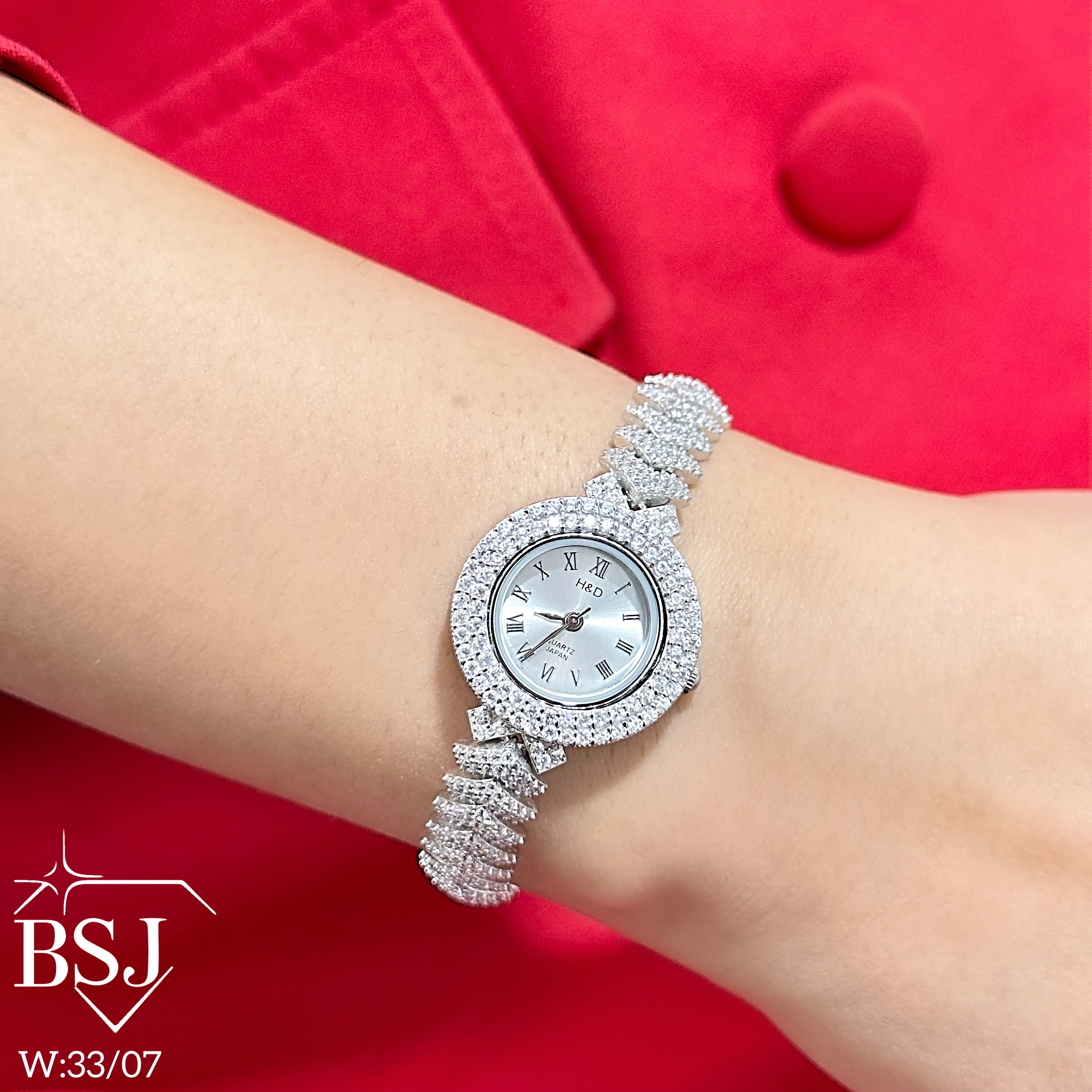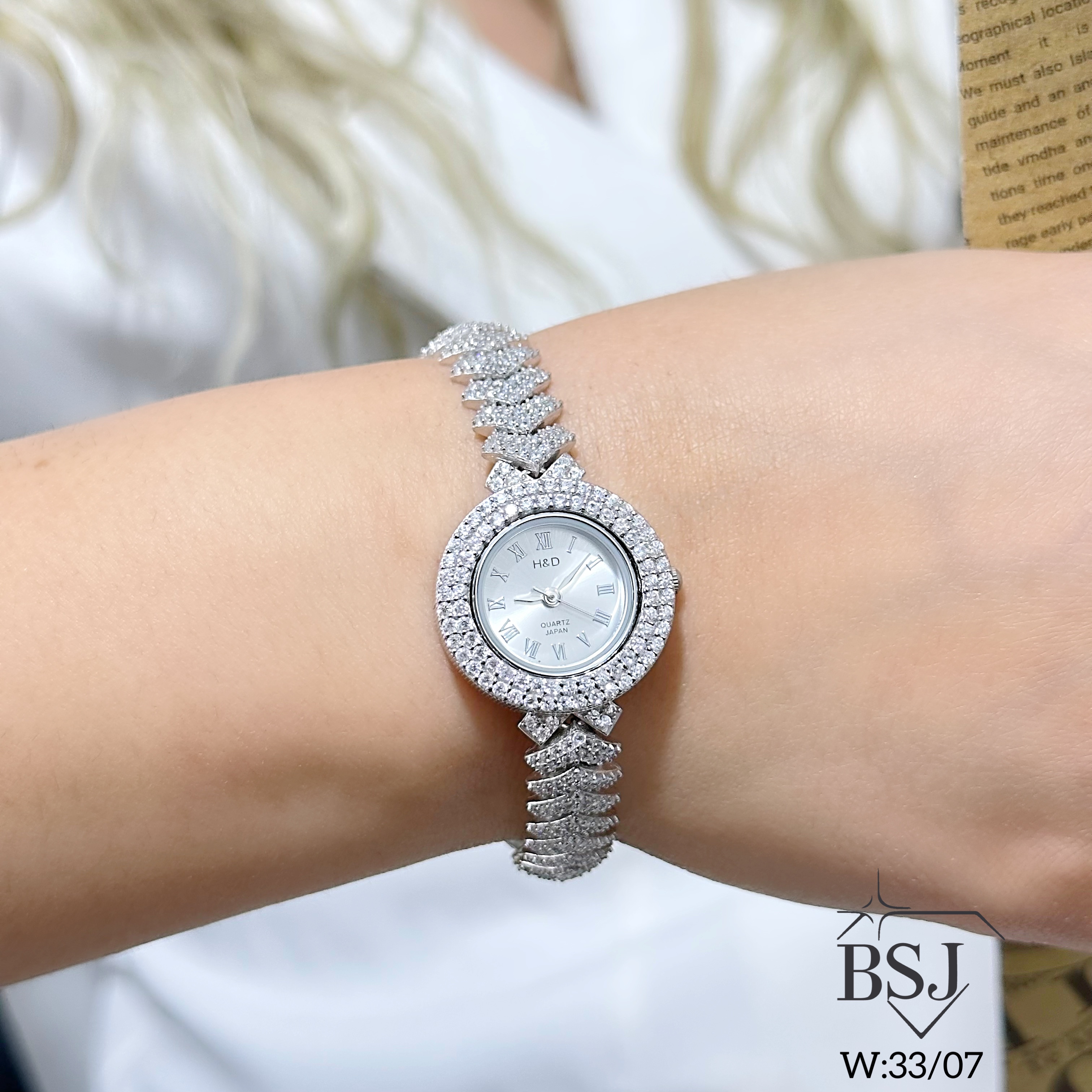 ساعت نقره جواهری زنانه BSJ_W503 از ساعت های مجلسی و شیک ساخته شده از نقره با عیار 925 می باشد.سنگ های به کار رفته در آن برلیان از جنس اتمی زیرکونیا می باشند که به صورت میکروستینگ مخراج کاری شده اند و در برابر ضربه مقاوم اند.به صورت کلی، ساعت های نقره در تمام مراکز فروش نقره در سراسر کشور به صورت وزن بدنه و موتور، یکجا خرید و فروش می شوند، جنس بدنه از نقره به عیار 925 بوده و تنها قسمتی از محصول که نقره نیست موتور آن می باشد.آبکاری دو مرحله ای رودیوم(طلا سفید)، سبب کیفیت بی نظیر دوام رنگ آن شده است و به دلیل عدم استفاده از نیکل در ساختار آن،بدون حساسیت بوده و با پوست حساس سازگار است.وزن تقریبی ساعت 33.07 گرم می باشد.