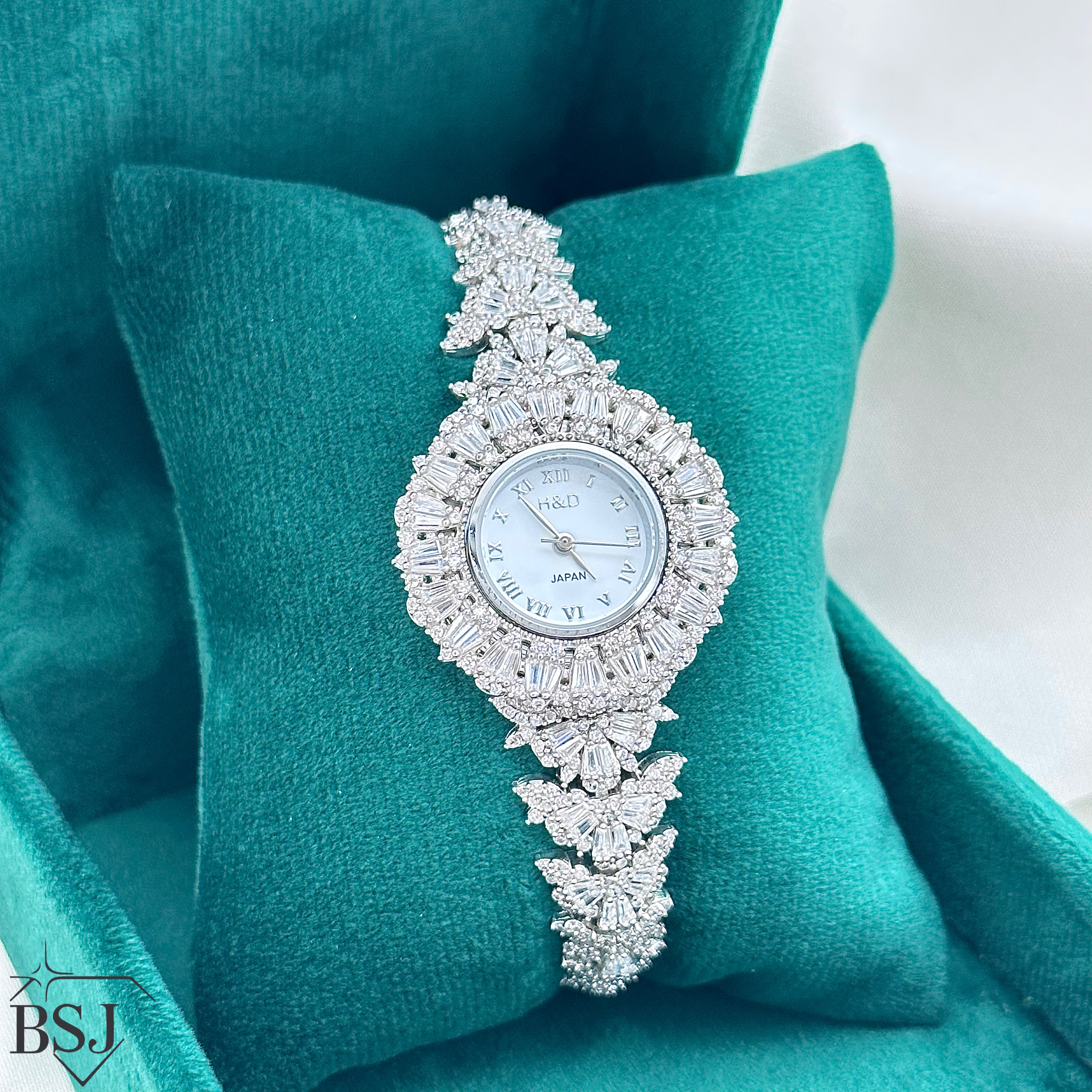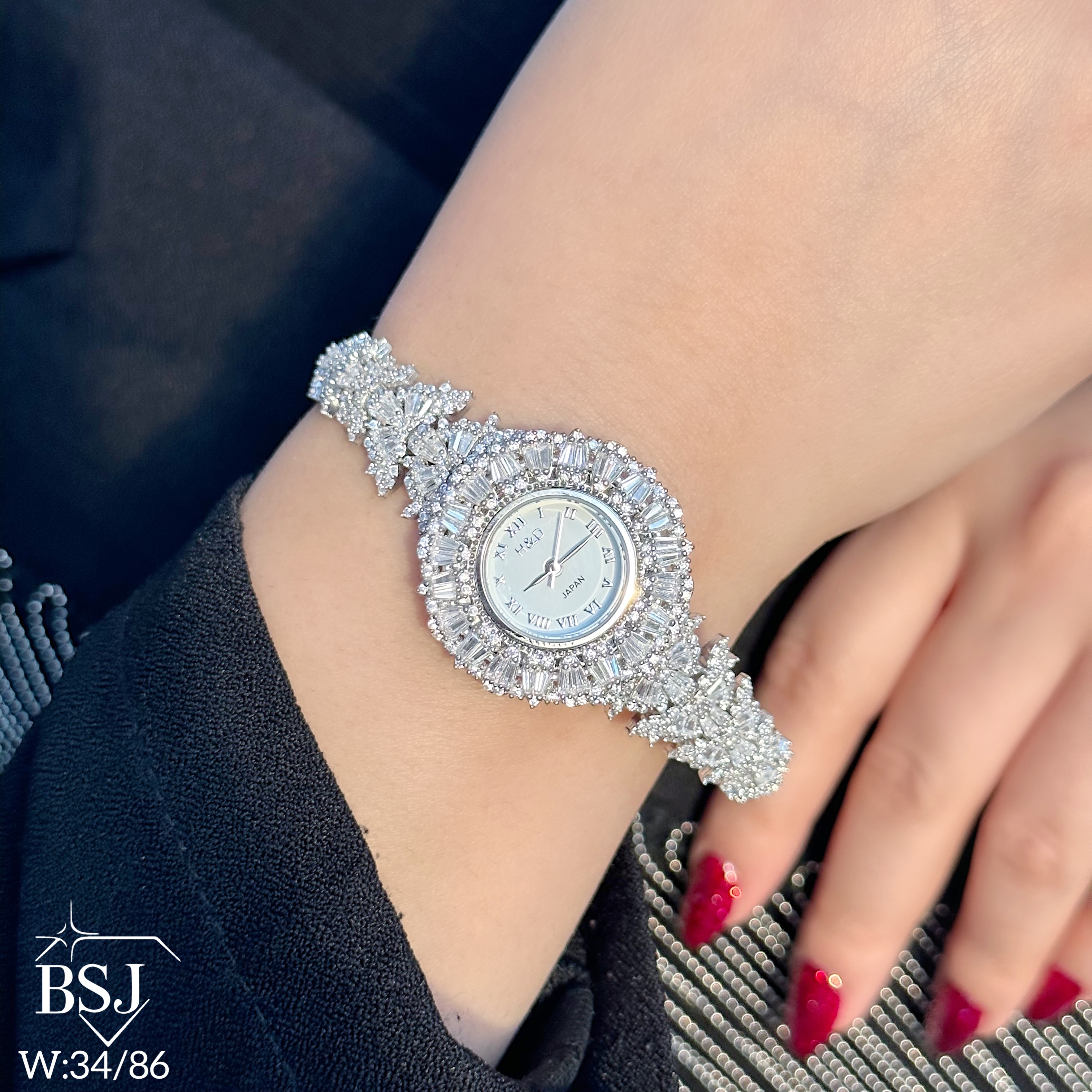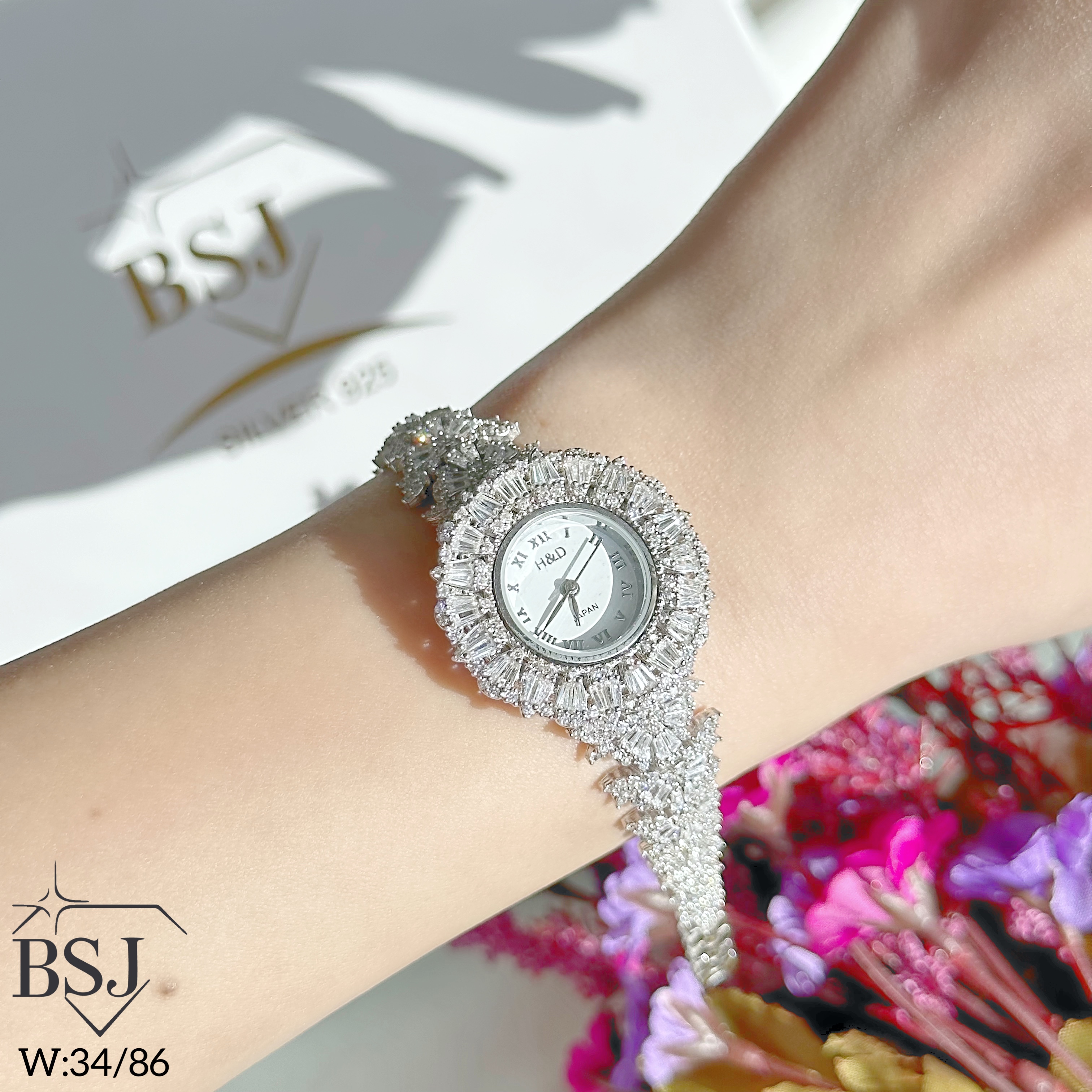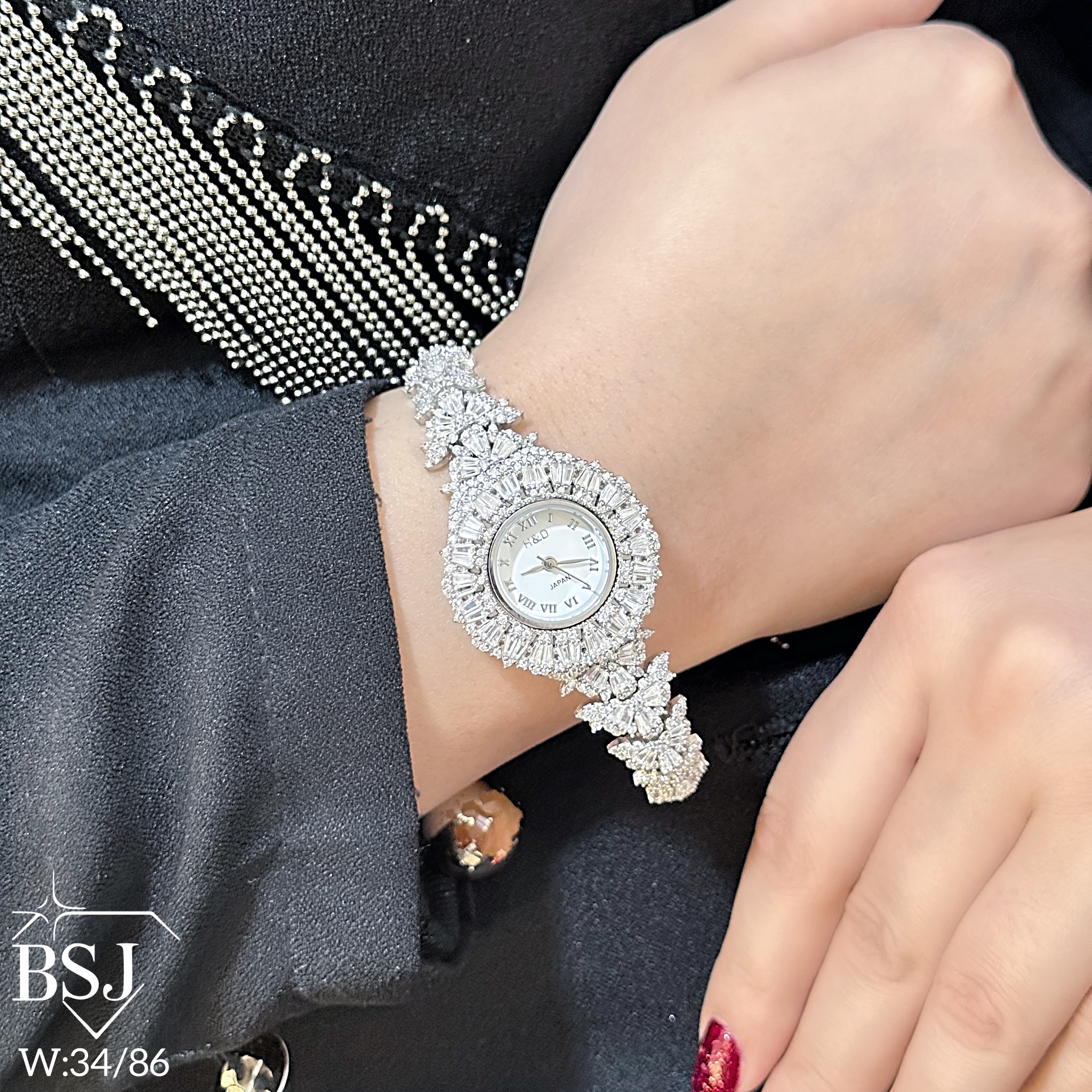 ساعت نقره جواهری زنانه BSJ_W506 از ساعت های شیک و جذاب ساخته شده از نقره با عیار 925 می باشد.سنگ های به کار رفته در آن برلیان و مارکیز از جنس اتمی زیرکونیا می باشند که به صورت میکروستینگ مخراج کاری شده اند و در برابر ضربه مقاوم اند.به صورت کلی، ساعت های نقره در تمام مراکز فروش نقره در سراسر کشور به صورت وزن بدنه و موتور، یکجا خرید و فروش می شوند، جنس بدنه از نقره به عیار 925 بوده. تنها قسمتی از محصول که نقره نیست موتور آن می باشد.آبکاری دو مرحله ای رودیوم(طلا سفید)، سبب کیفیت بی نظیر دوام رنگ آن شده است و به دلیل عدم استفاده از نیکل در ساختار آن،بدون حساسیت بوده و با پوست حساس سازگار است.وزن تقریبی ساعت +-34.86گرم می باشد.