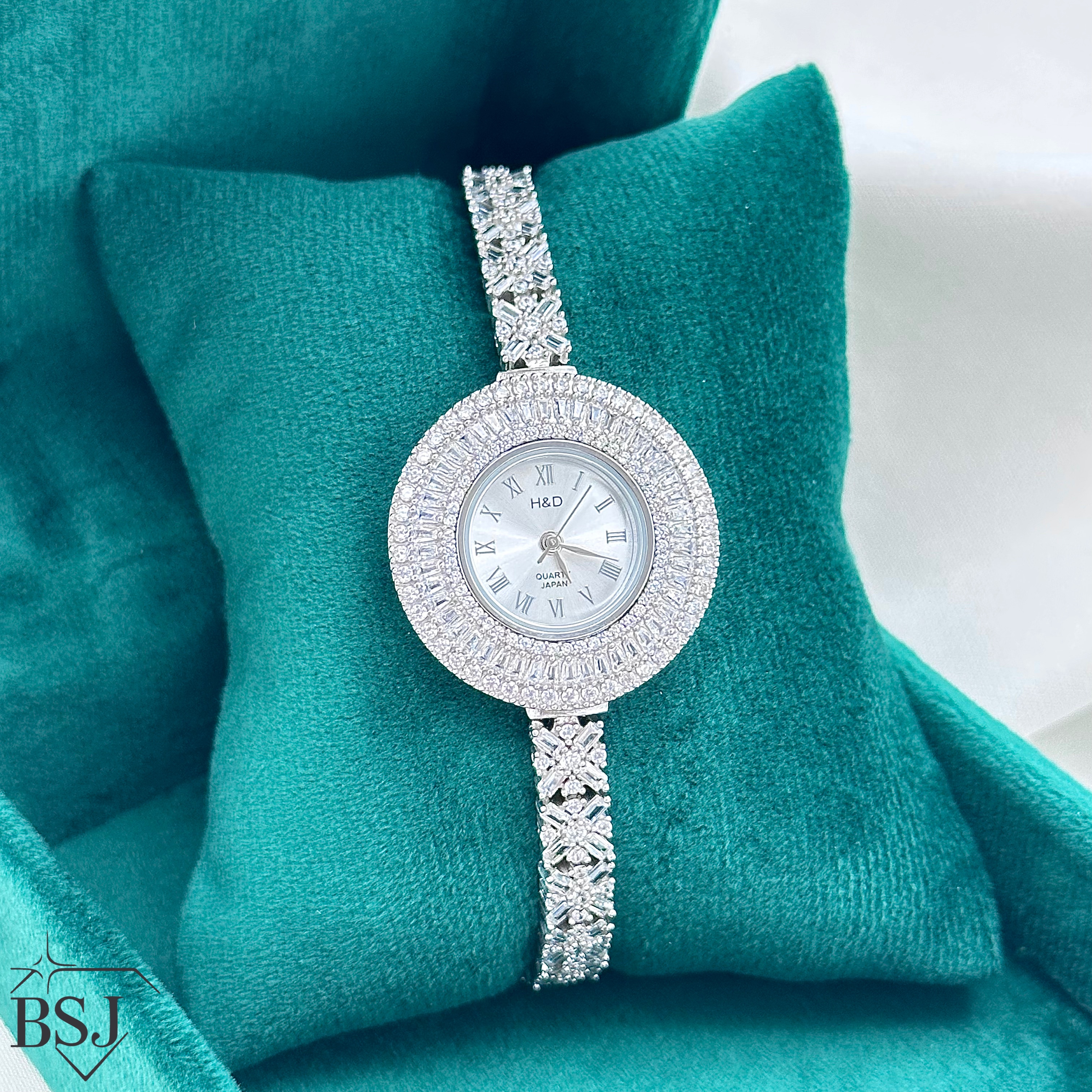 ساعت نقره جواهری زنانه BSJ_W507 از ساعت های شیک و جذاب ساخته شده از نقره با عیار 925 می باشد.سنگ های به کار رفته در آن برلیان و مارکیز از جنس اتمی زیرکونیا می باشند که به صورت میکروستینگ مخراج کاری شده اند و در برابر ضربه مقاوم اند.به صورت کلی، ساعت های نقره در تمام مراکز فروش نقره در سراسر کشور به صورت وزن بدنه و موتور، یکجا خرید و فروش می شوند، جنس بدنه از نقره به عیار 925 بوده. تنها قسمتی از محصول که نقره نیست موتور آن می باشد.آبکاری دو مرحله ای رودیوم(طلا سفید)، سبب کیفیت بی نظیر دوام رنگ آن شده است و به دلیل عدم استفاده از نیکل در ساختار آن،بدون حساسیت بوده و با پوست حساس سازگار است.وزن تقریبی ساعت +-32.84گرم می باشد.