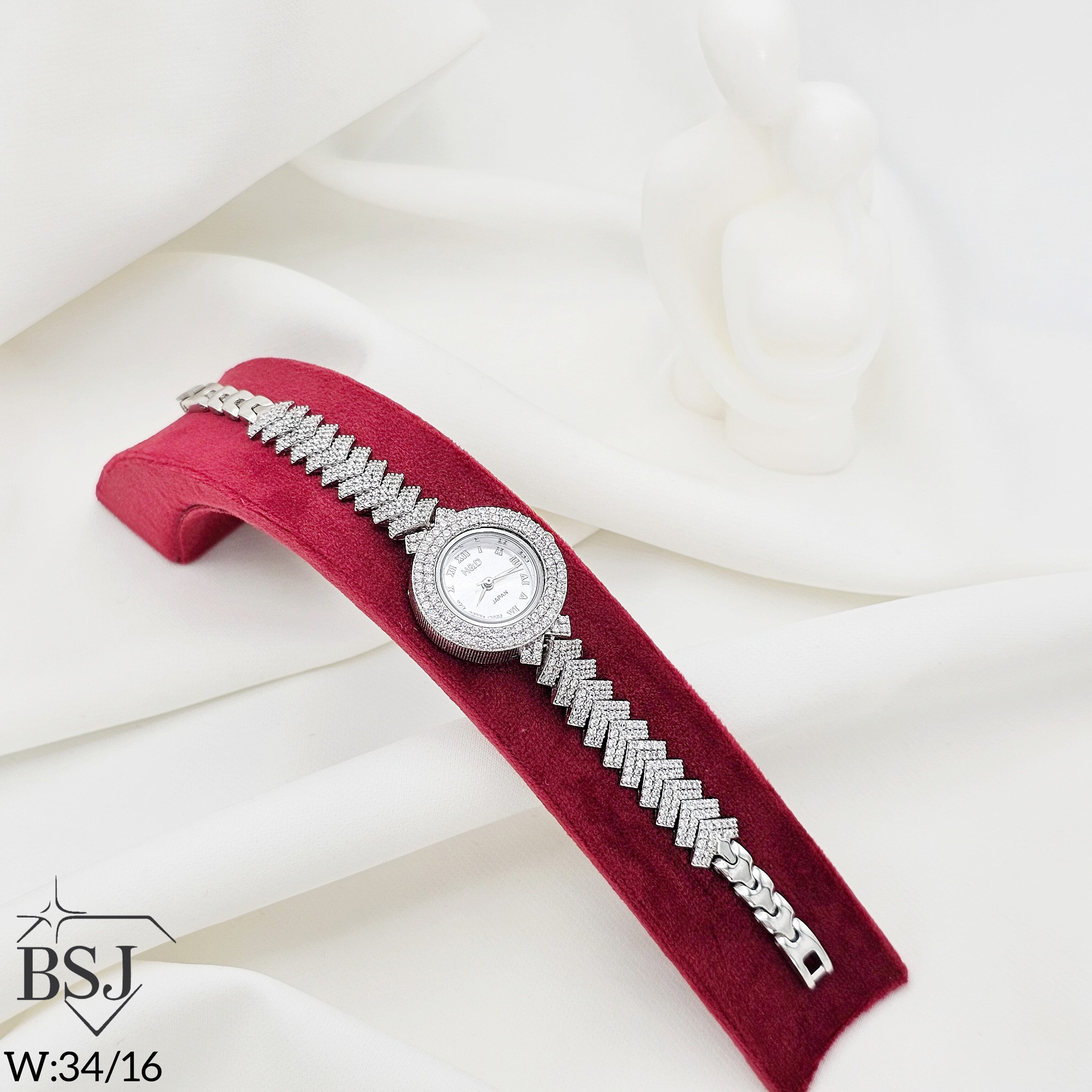 ساعت نقره جواهری زنانه BSJ_W515 از ساعت های شیک و جذاب ساخته شده از نقره با عیار 925 می باشد.سنگ های به کار رفته در آن برلیان از جنس اتمی زیرکونیا می باشند که به صورت میکروستینگ مخراج کاری شده اند و در برابر ضربه مقاوم اند.جنس بدنه از نقره به عیار 925 بوده و تنها قسمتی از محصول که نقره نیست موتور آن می باشد.آبکاری دو مرحله ای رودیوم(طلا سفید)، سبب کیفیت بی نظیر دوام رنگ آن شده است و به دلیل عدم استفاده از نیکل در ساختار آن،بدون حساسیت بوده و با پوست حساس سازگار است.وزن تقریبی ساعت +- 34.16 گرم می باشد.