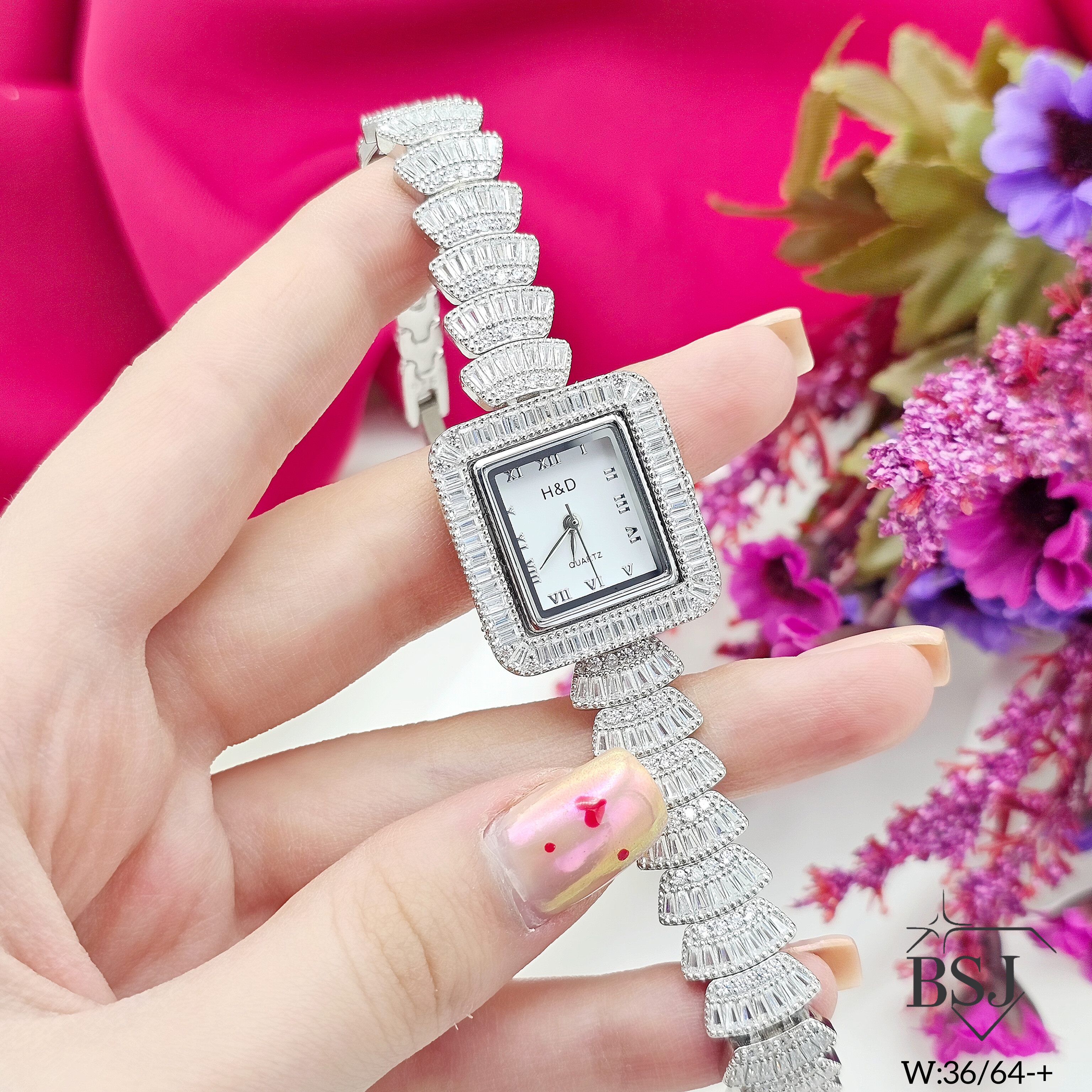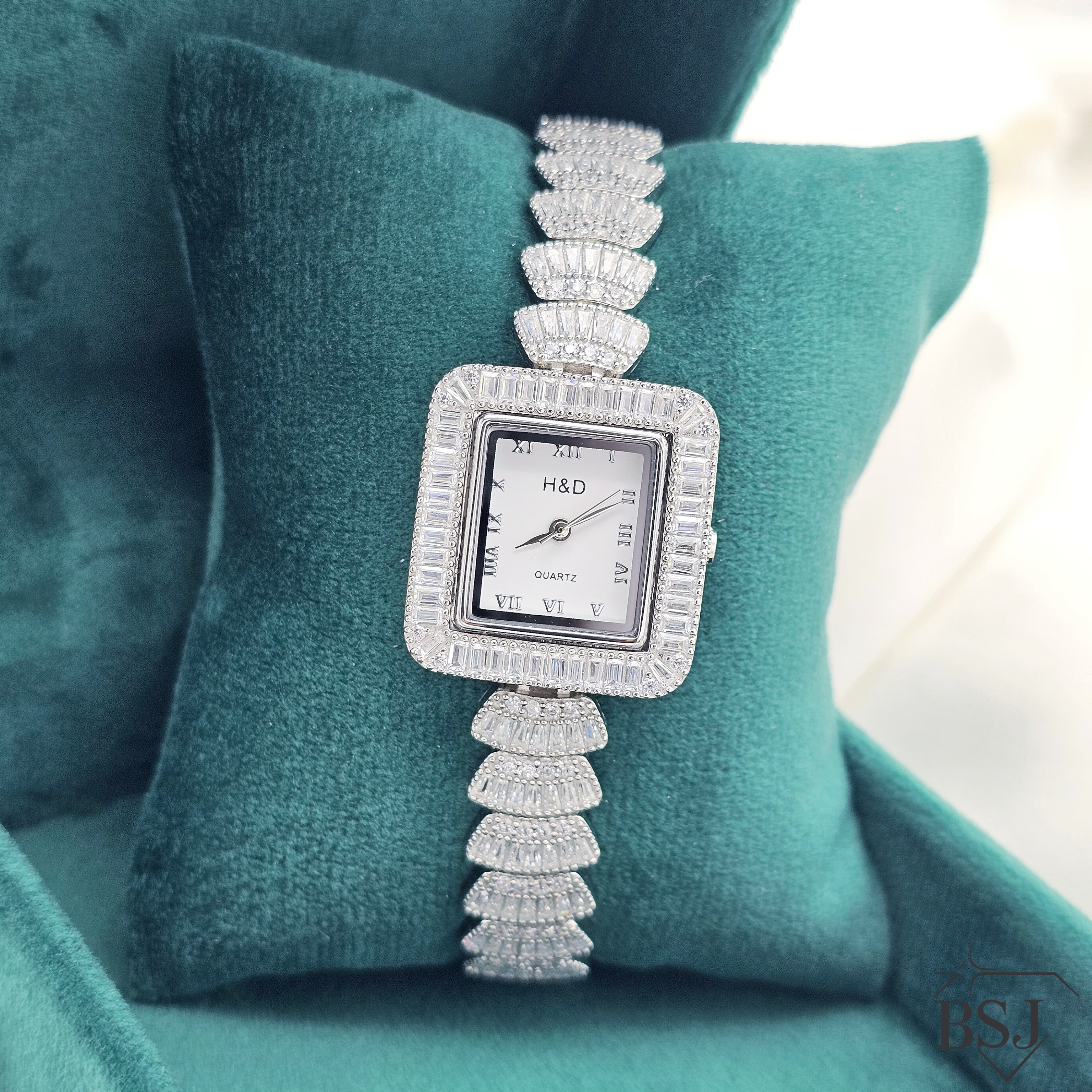ساعت نقره جواهری زنانه BSJ_W519 از ساعت های شیک و جذاب ساخته شده از نقره با عیار 925 می باشد.سنگ های به کار رفته در آن امرالد و برلیان از جنس اتمی زیرکونیا می باشند که به صورت میکروستینگ مخراج کاری شده اند و در برابر ضربه مقاوم اند.جنس بدنه از نقره به عیار 925 بوده و تنها قسمتی از محصول که نقره نیست موتور آن می باشد.آبکاری دو مرحله ای رودیوم(طلا سفید)، سبب کیفیت بی نظیر دوام رنگ آن شده است و به دلیل عدم استفاده از نیکل در ساختار آن،بدون حساسیت بوده و با پوست حساس سازگار است.وزن تقریبی ساعت +- 36.64 گرم می باشد.